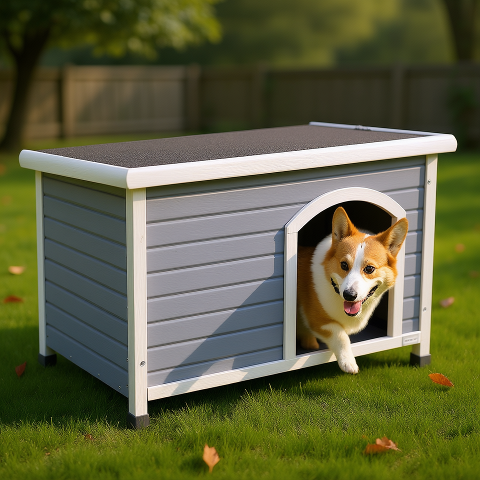 บ้านสุนัขกลางแจ้งไม้ขนาดกลาง หลังคาป้องกันน้ำ ขาตั้งยกสูง เฟอร์นิเจอร์สำหรับสัตว์เลี้ยงสำหรับสุนัขทุกฤดู ดีไซน์ทันสมัย