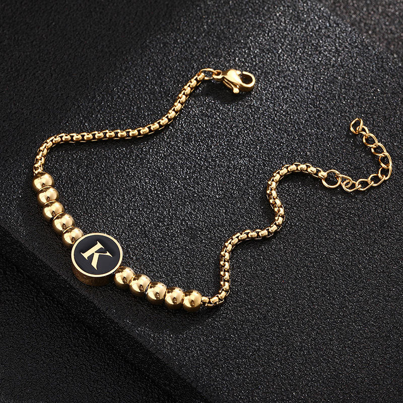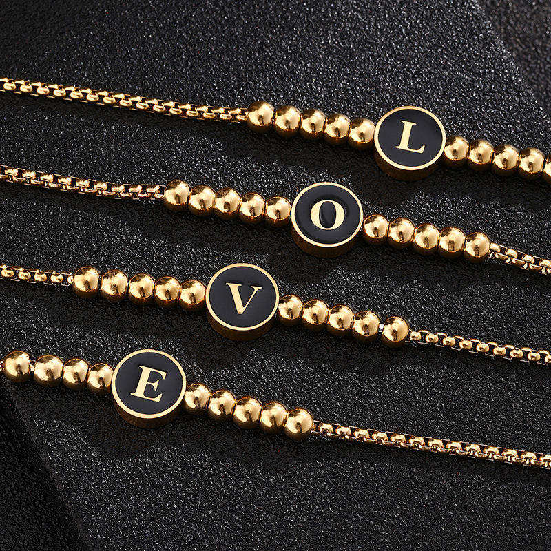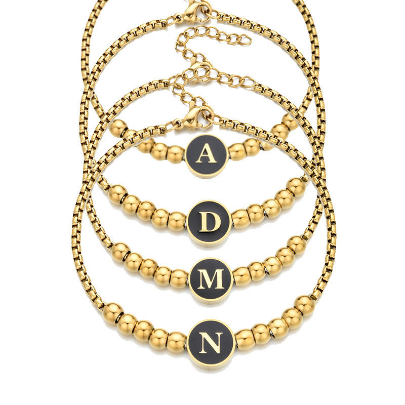 Meetyoo สร้อยข้อมือลูกปัดสแตนเลสออกแบบใหม่26ตัวอักษรชื่อ DIY สร้อยข้อมือผู้หญิงทันสมัยเครื่องประดับ PVD 18K ทอง
