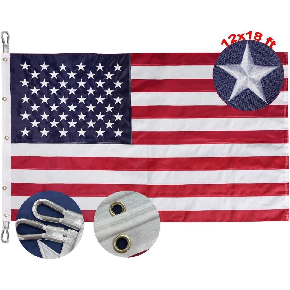 ธงชาติอเมริกันขนาดใหญ่พิเศษ 12x18 ฟุต ปักลายดาว ผ้าไนลอนอย่างดี สำหรับใช้งานกลางแจ้ง พร้อมห่วงทองเหลือง 5 จุด แบบธงสามเหลี่ยม สไตล์อเมริกัน คุณภาพเยี่ยม