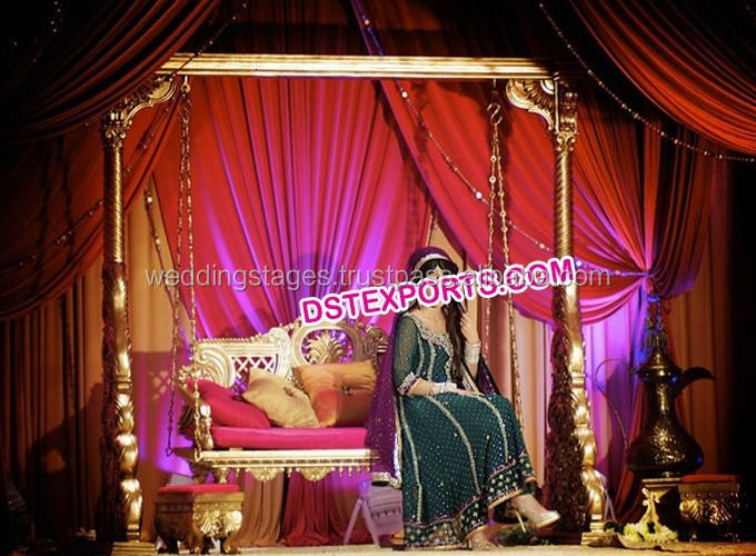 Mehandi กลางคืนตกแต่งนกยูงอินเดียแต่งงานสีสัน Mehandi Stage Sangeet Stage Decor Swing