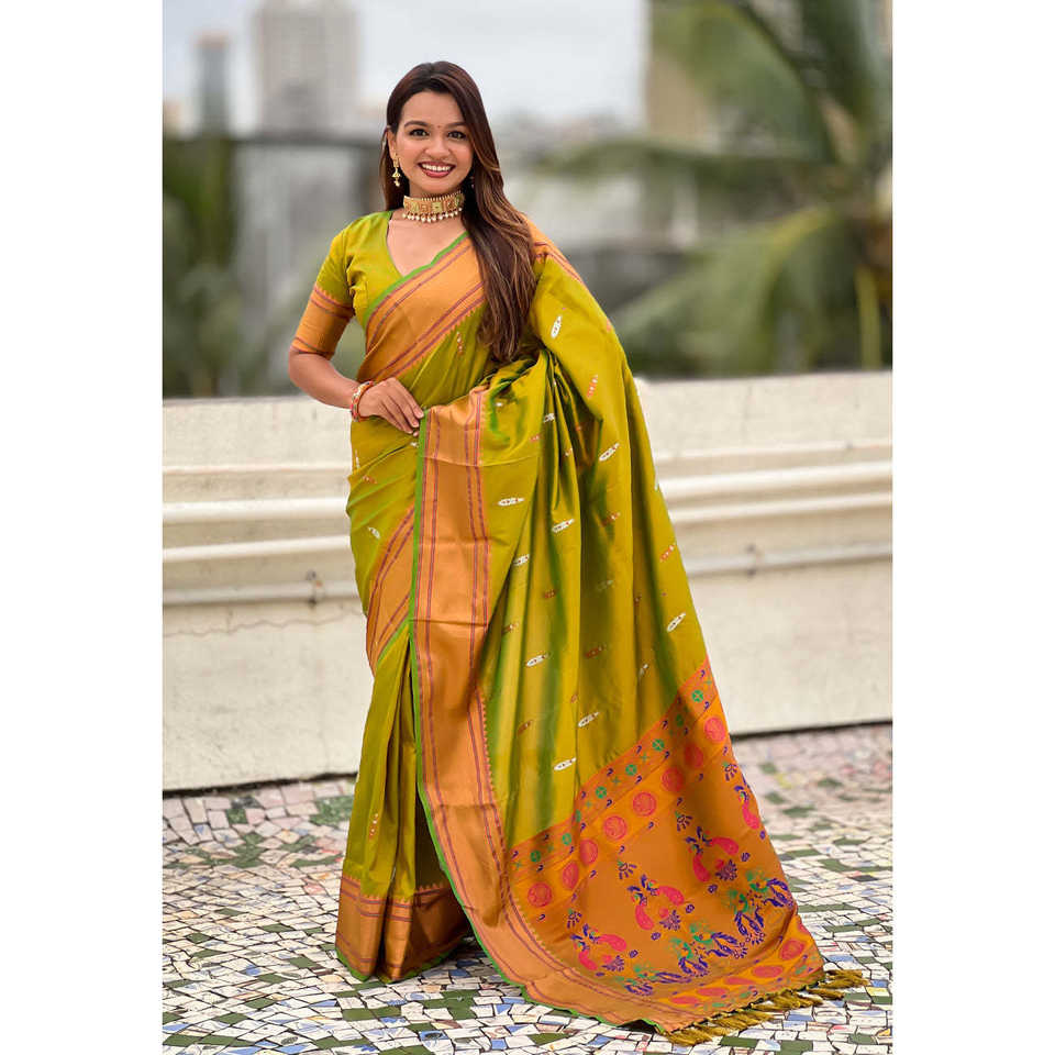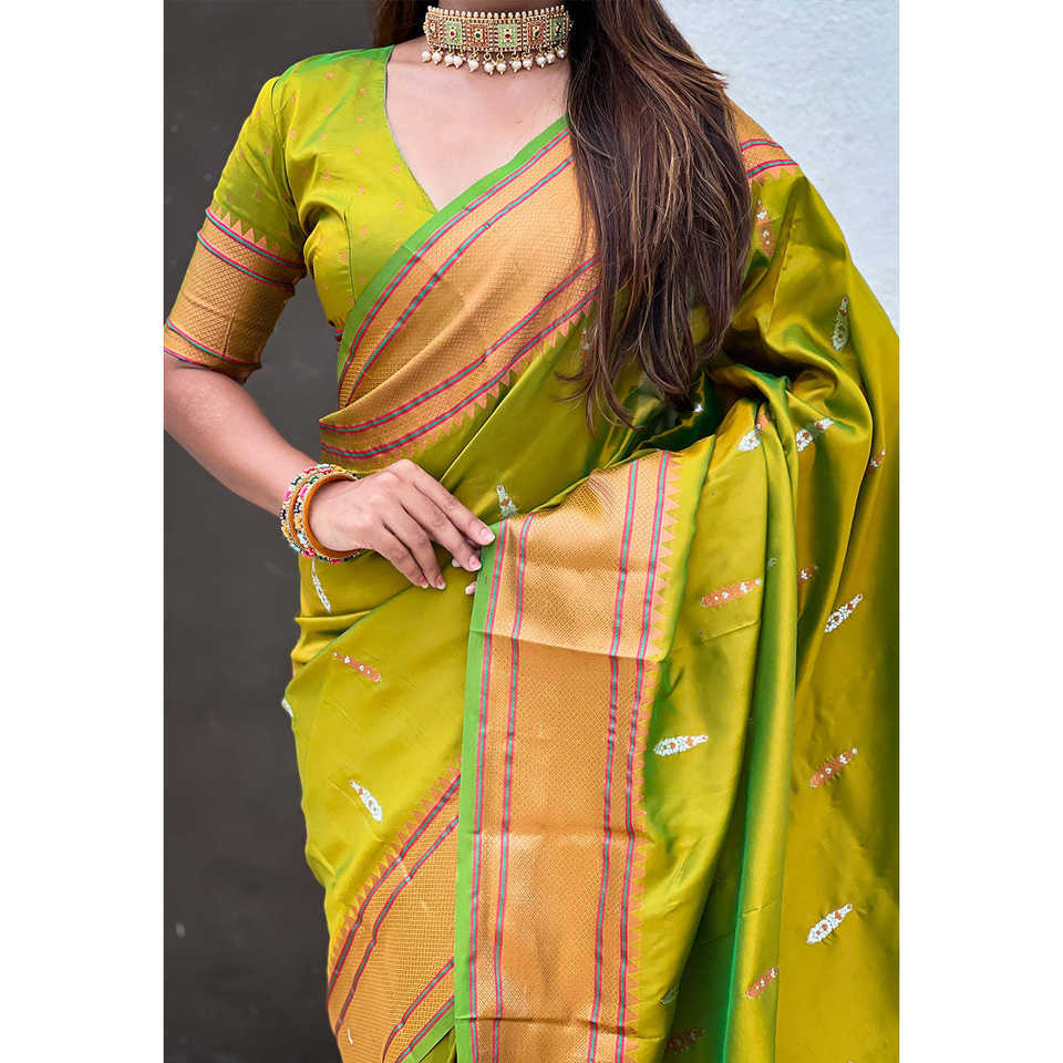 ผ้าไหมเยโอล่าแบบดั้งเดิมลายเมเฮนดีสีเขียวประดับด้วยดิ้นทองคู่ ผ้าไหมปายทานี ชุดอินเดียและปากีสถาน งานทอระดับพรีเมียม น้ำหนัก 650 กรัม