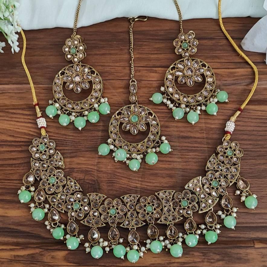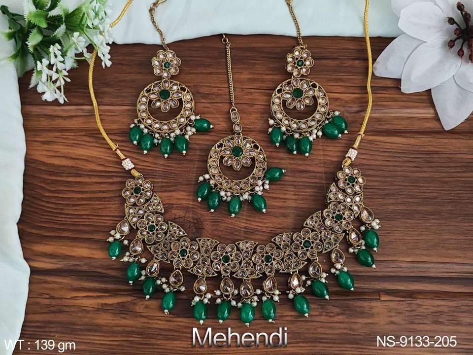 Mehendi ชุดเครื่องประดับสไตล์โปแลนด์สำหรับผู้หญิง,ชุดสร้อยคอโชคเกอร์แฟชั่นงานปาร์ตี้หินโบราณเต็มชุดพร้อม Maang Tikka