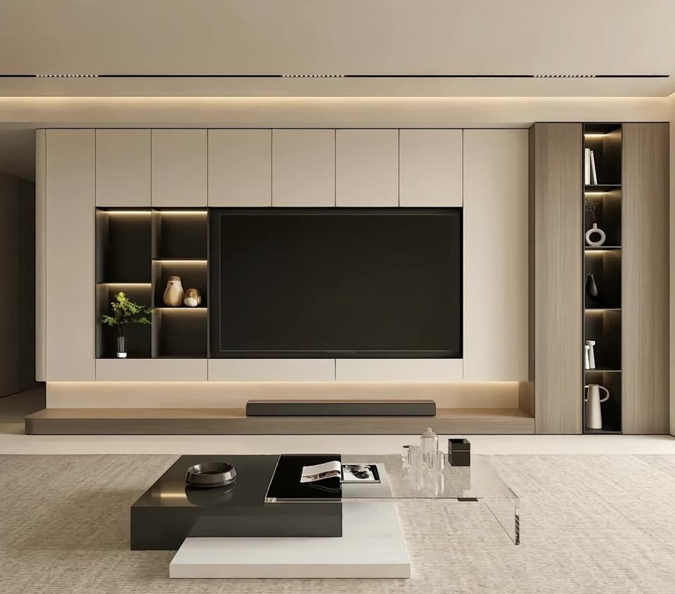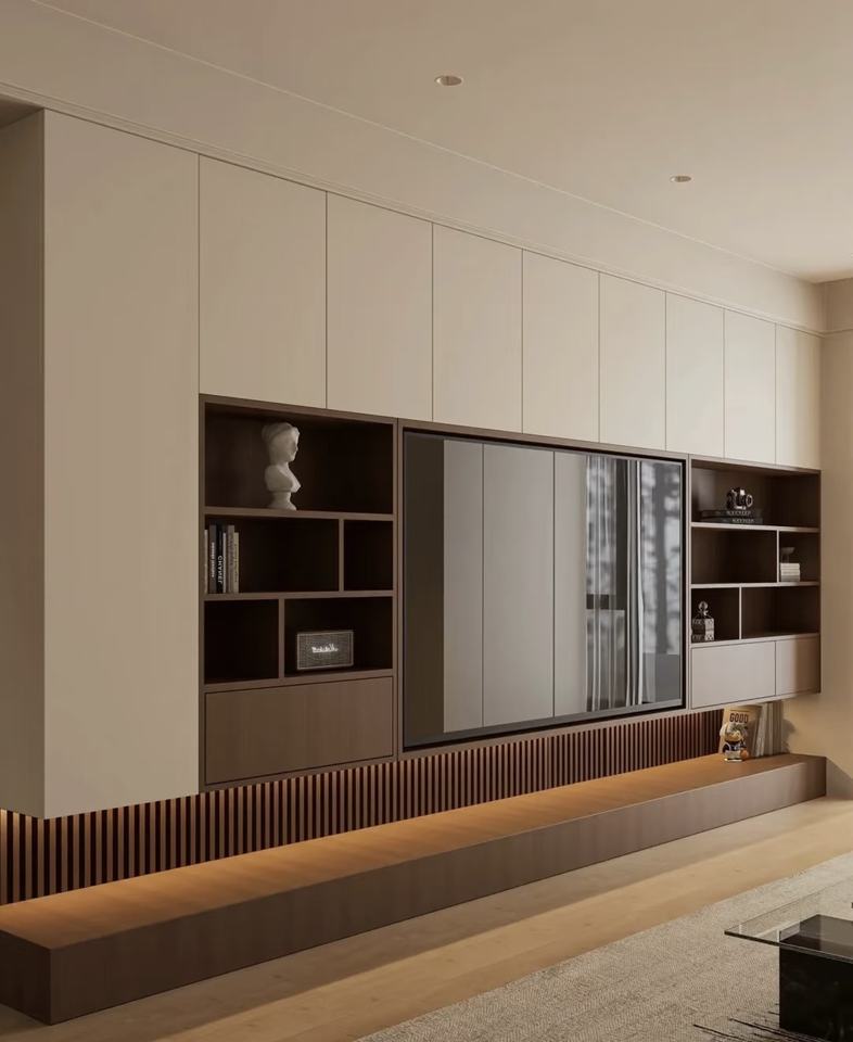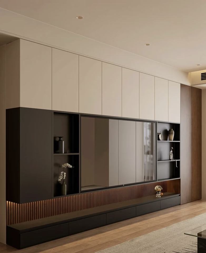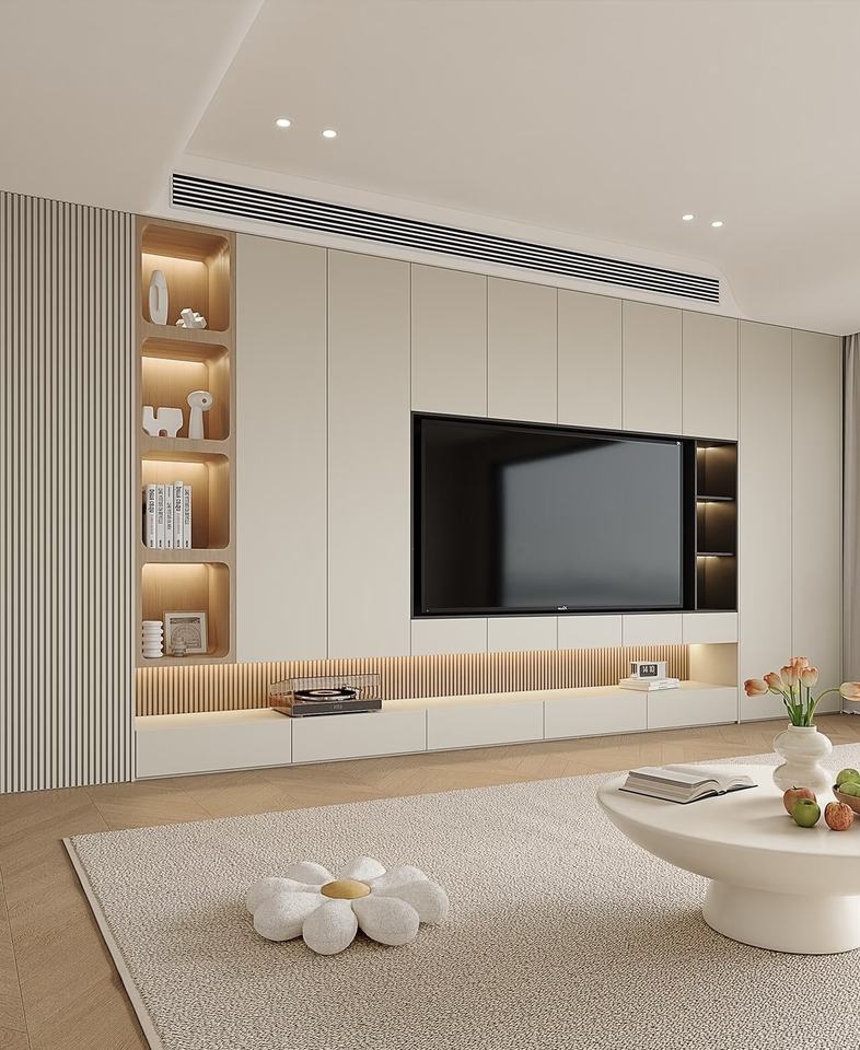 แผงประตูเมลามีน ดีไซน์โมเดิร์นมินิมอล ตู้วางทีวีติดผนังห้องนั่งเล่นแบบกำหนดเอง พร้อมที่เก็บของแบบซ่อน