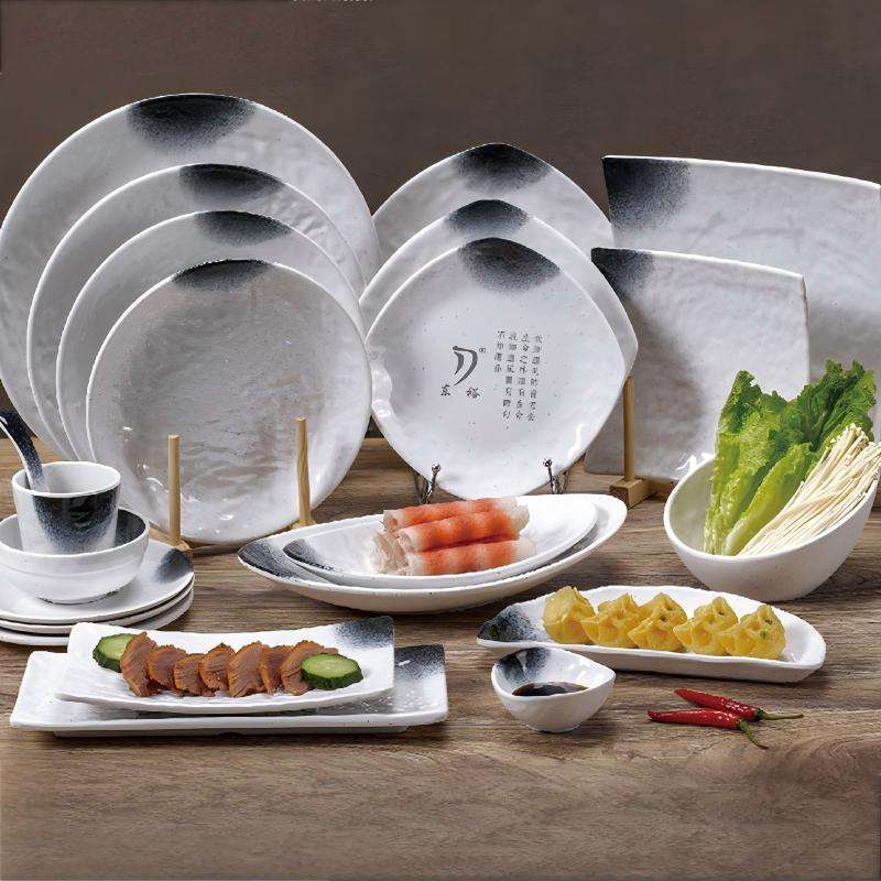 ชุดภาชนะเมลามีน 100 ชิ้น ปลอดสารพิษ เกรดอาหาร ใช้กับเครื่องล้างจานได้ สีขาวน้ำเงิน ดีไซน์มินิมอล เหมาะสำหรับร้านอาหาร ร้านฮอทพอท