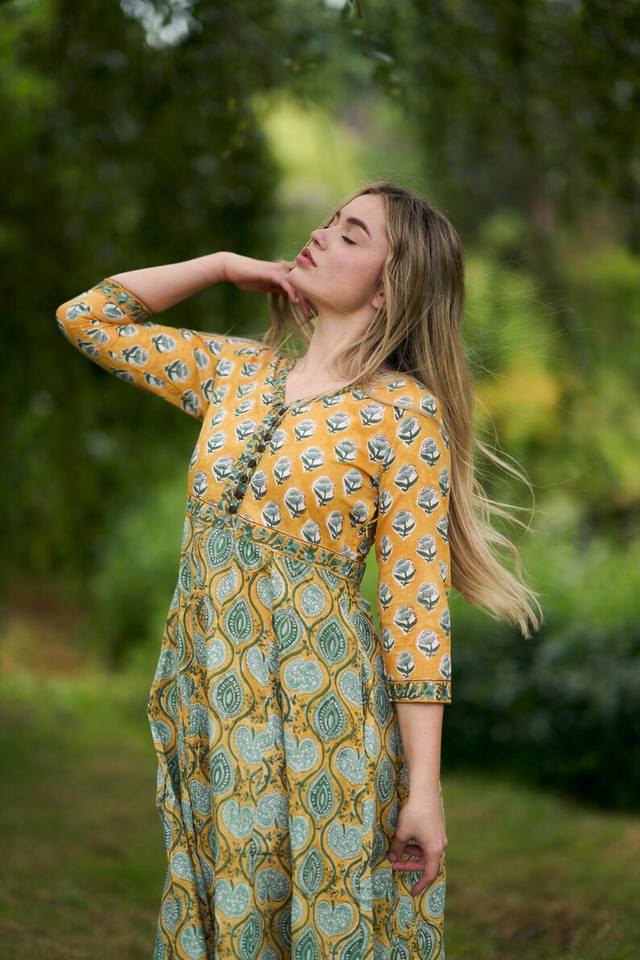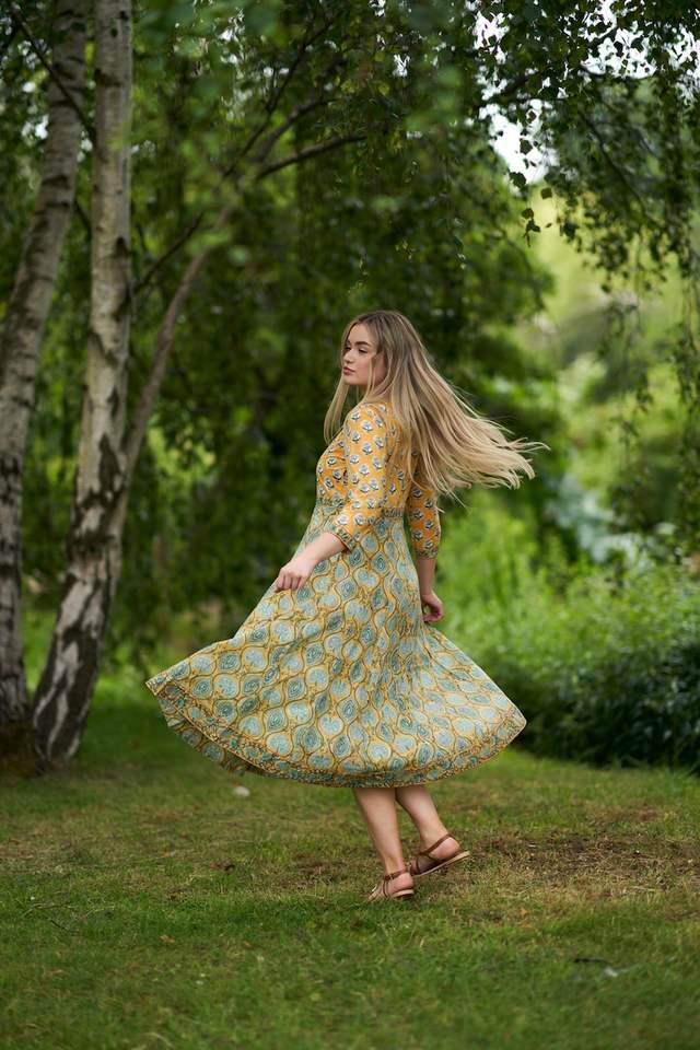 เดรสผ้าฝ้ายแท้สไตล์โบฮีเมียนของเมลิน่า พิมพ์ลายด้วยมือ สีเหลืองเขียว ลำลอง ใส่ได้หลายโอกาส แฟชั่นที่เป็นมิตรต่อสังคม