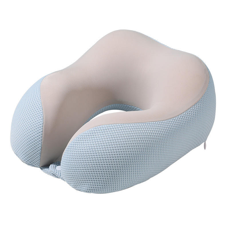 หมอนรองคอเมมโมรี่โฟมรูปตัวยู สีฟ้าอ่อน ตาข่ายระบายความร้อน สำหรับเครื่องบิน สำนักงาน หรือนอนกลางวัน