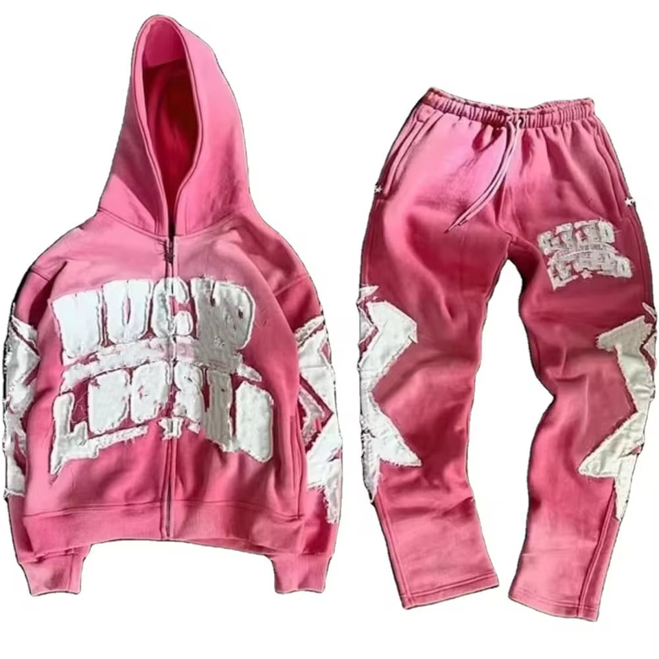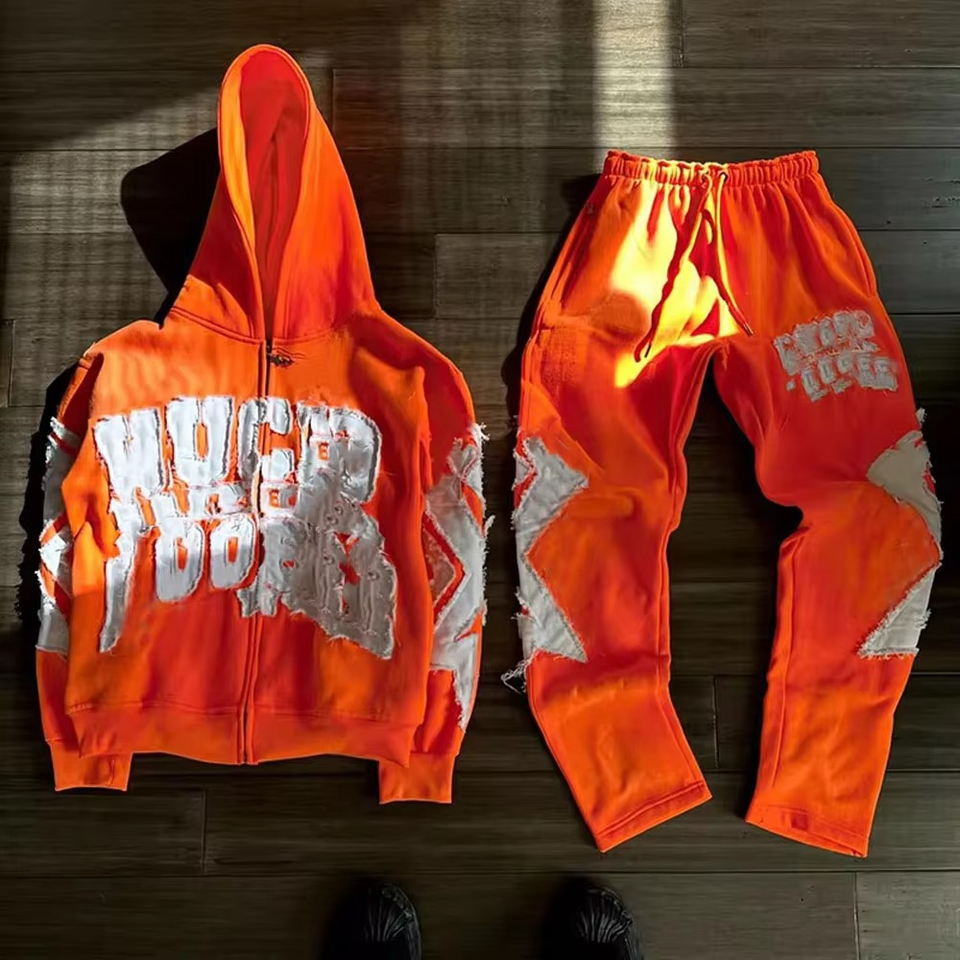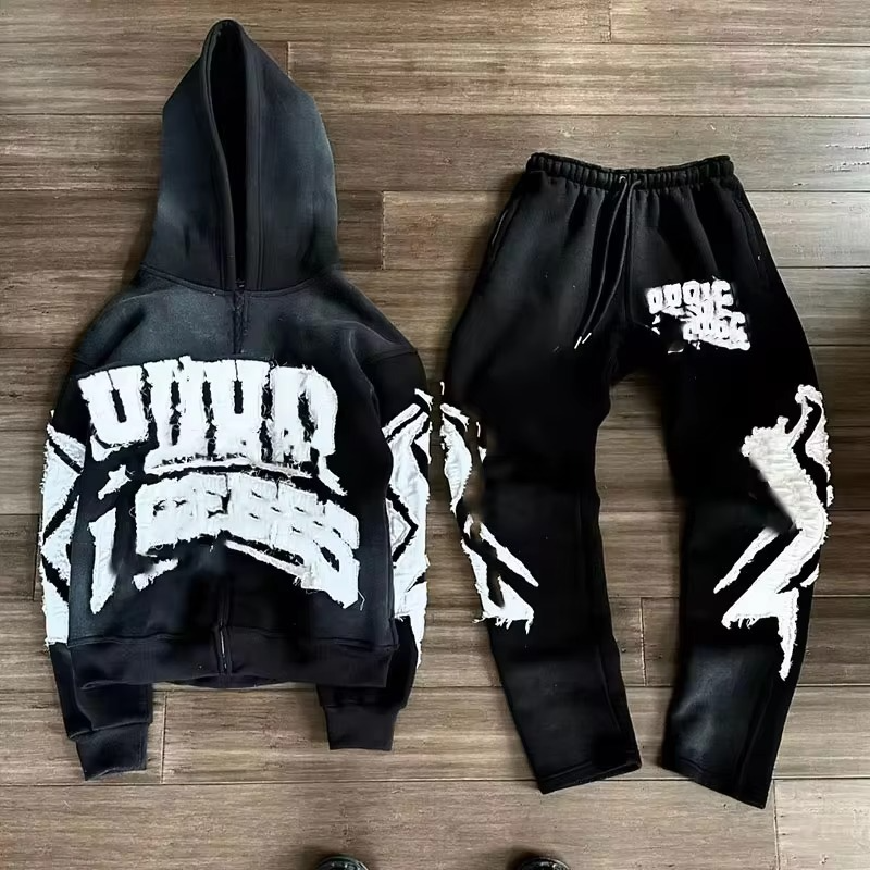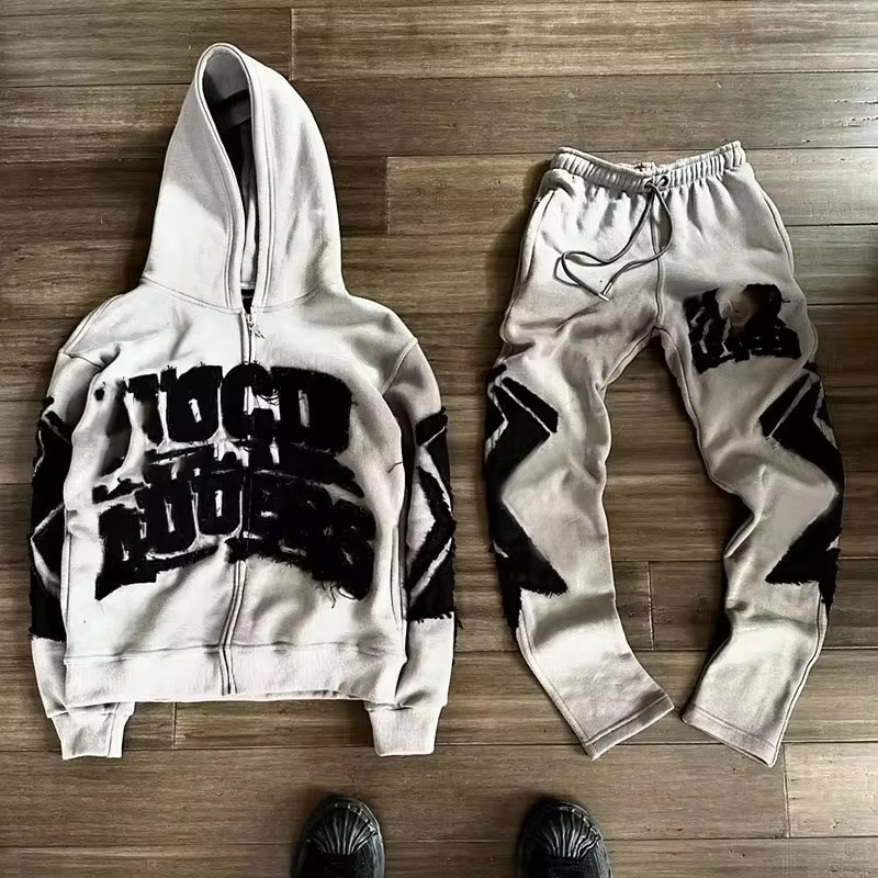 ชุดวอร์มผู้ชายผ้าฝ้ายฟลีซ 100% ปักลายแบบดิสเทรส แอพพลิเค่ ระบายอากาศได้ดี ฮู้ดดี้และกางเกงขายาวทรงโอเวอร์ไซส์ ซับในบุผ้า ตกแต่งด้วยแพทช์ เหมาะสำหรับฤดูใบไม้ร่วง