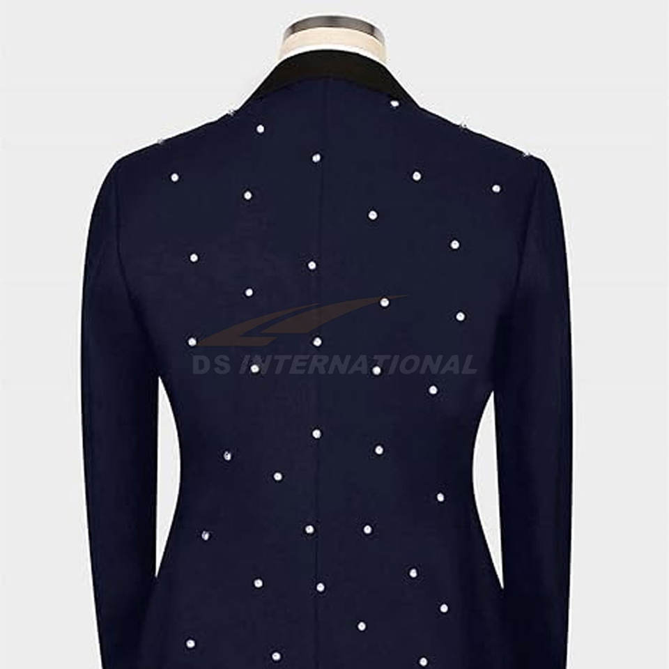 ชุดสูทผู้ชาย 2 ชิ้น สีกรมท่า ทรงเข้ารูป กระดุมสองแถว พร้อมกางเกง ตกแต่งคริสตัลแฮนด์เมด ผ้าโพลีเอสเตอร์ สำหรับงานพิธีการ