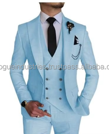 เสื้อสูทผ้าลูกฟูกกระดุมสองแถวสำหรับผู้ชาย3ชิ้นสีฟ้าอ่อนป้องกันริ้วรอยสำหรับงานแต่งงานสไตล์อิตาลี