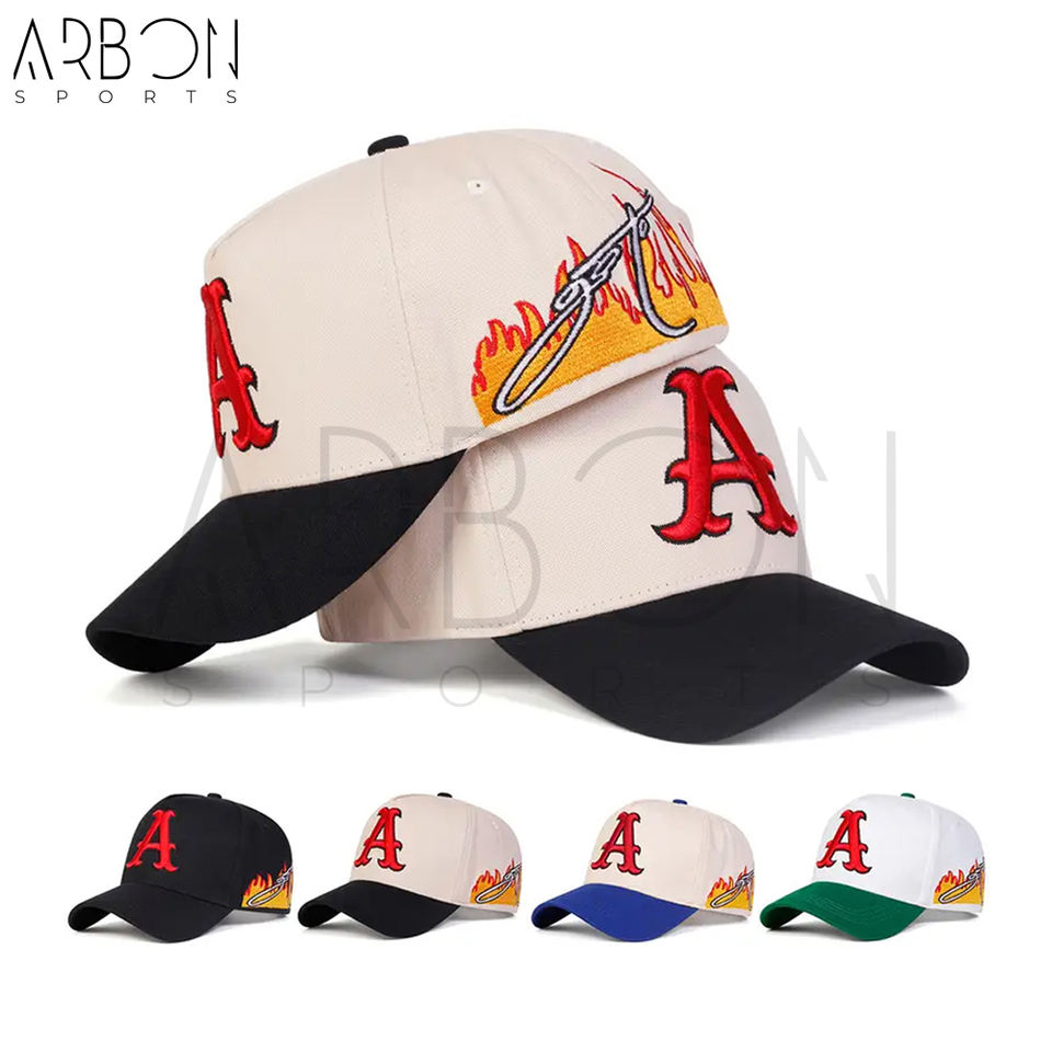 หมวกเบสบอลสำหรับผู้ชายปรับได้พร้อมดีไซน์ด้านข้างเป็นเปลวไฟสไตล์ลำลองวัสดุที่ดีที่สุดกำหนดโลโก้ป้องกันแสงแดดได้เอง