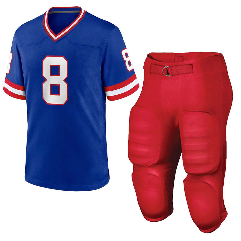 ชุดเสื้อและกางเกงอเมริกันฟุตบอลสีน้ำเงิน แดง ขาว ปรับแต่งได้สำหรับทีม ชุดฝึกซ้อมและแข่งขัน