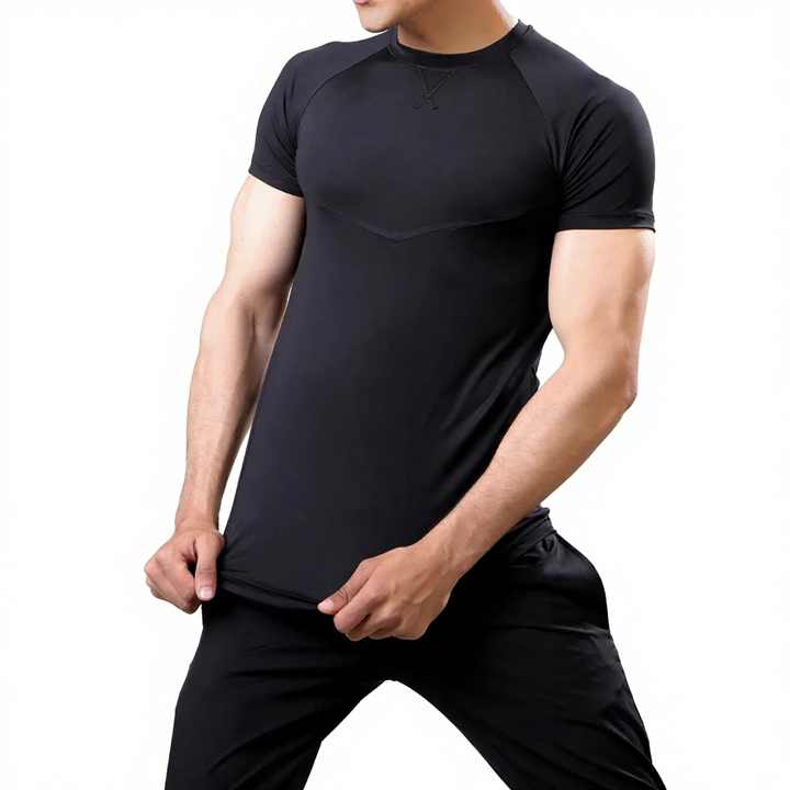 เสื้อยืดออกกำลังกายผู้ชาย สีดำ ระบายอากาศได้ดี เหมาะสำหรับฟิตเนส กีฬา และกิจกรรมกลางแจ้ง