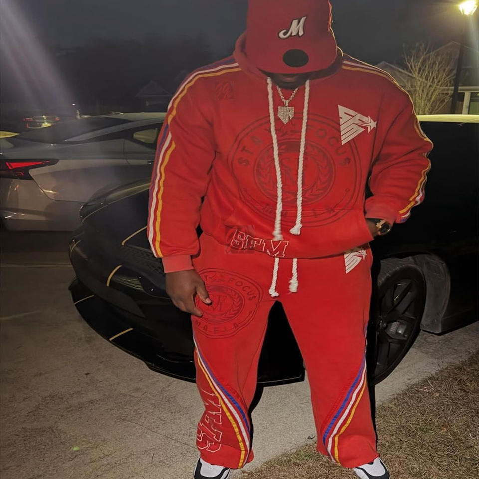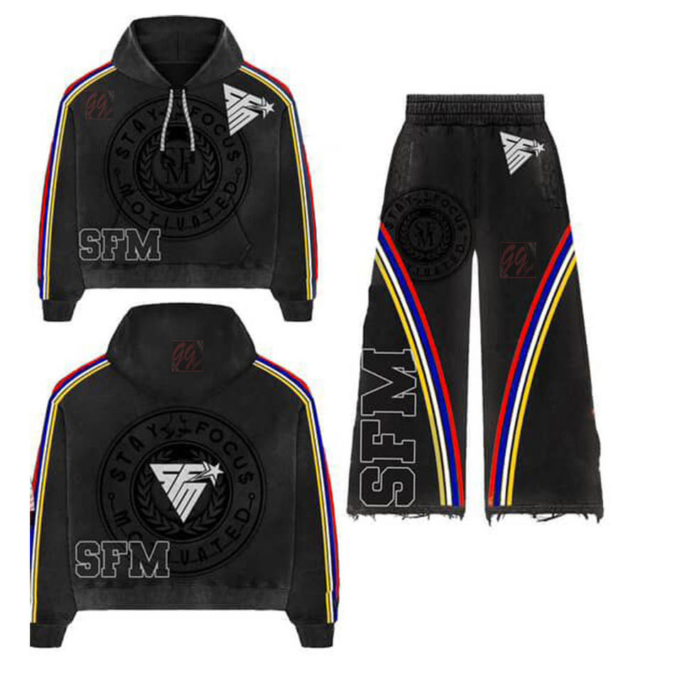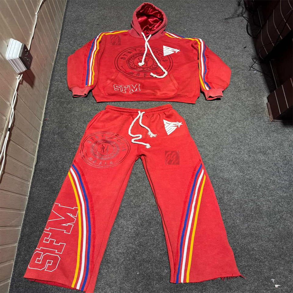 ชุดวอร์มลำลองสำหรับผู้ชาย ผ้าหนา 450 GSM แบบซักแล้ว ชุดเซ็ตสีพื้น พิมพ์ลายด้วยเทคนิค Heat-Transfer ปักโลโก้