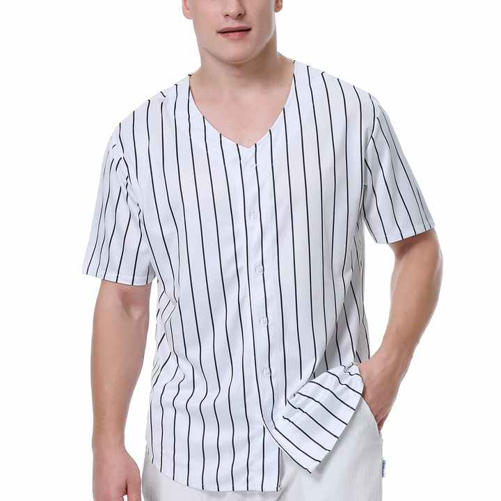 เสื้อเบสบอลผู้ชายเสื้อสีล้วนแบบลำลองมีกระดุมเสื้อแขนสั้นเสื้อยืดกีฬาลายทาง S-2XL