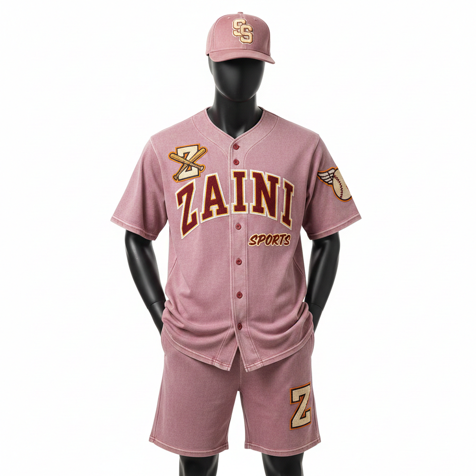 ชุดกีฬาเบสบอลชาย ชุดเซ็ตคุณภาพสูง ผ้าโพลีเอสเตอร์ตาข่าย นุ่ม ระบายอากาศได้ดี สีชมพู พร้อมโลโก้ปักลาย สำหรับผู้ชาย
