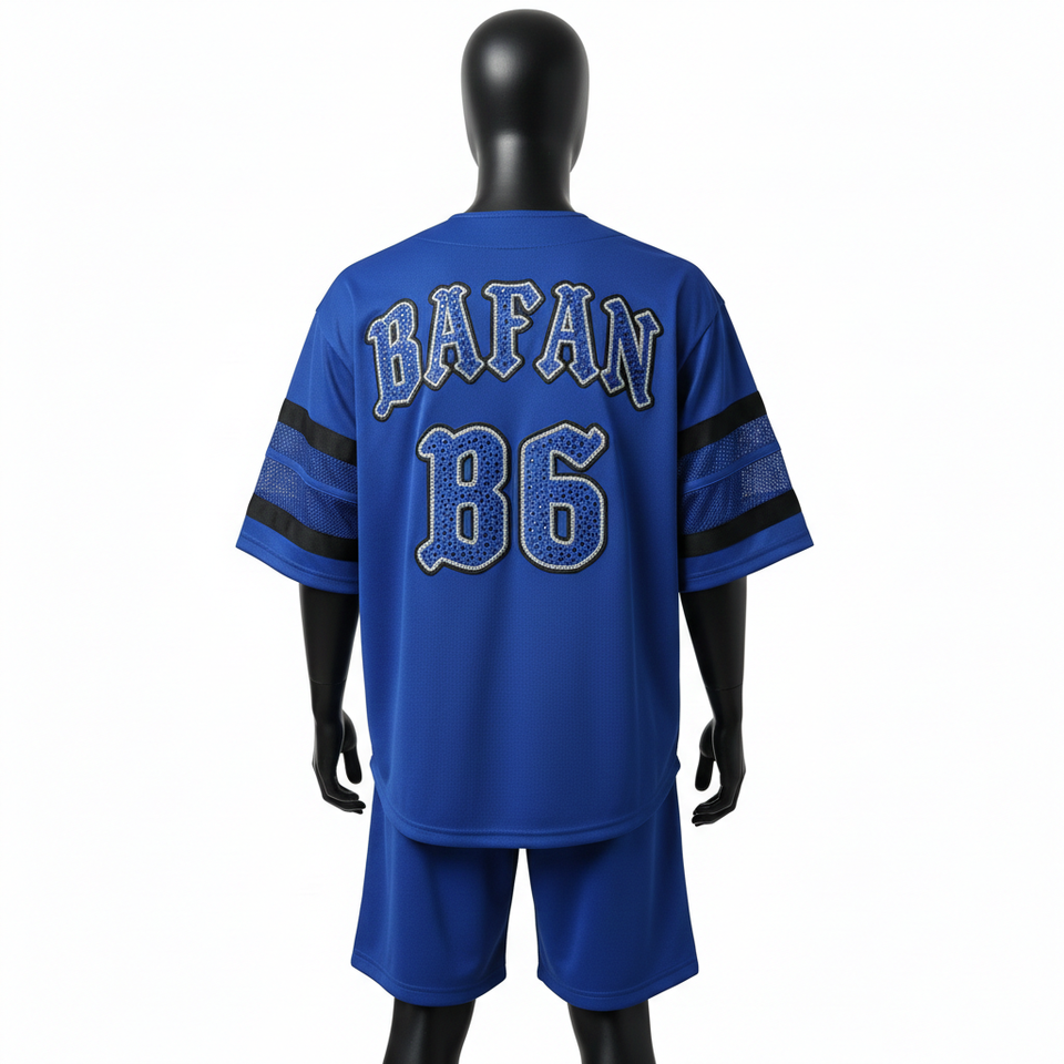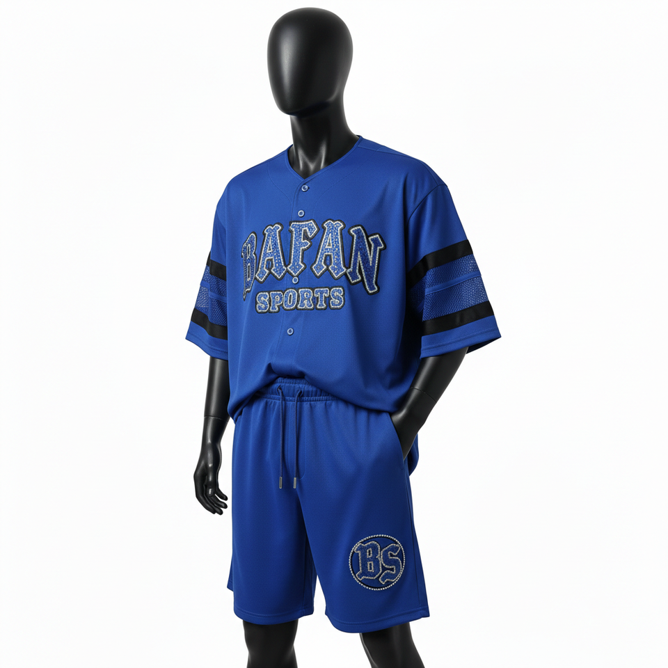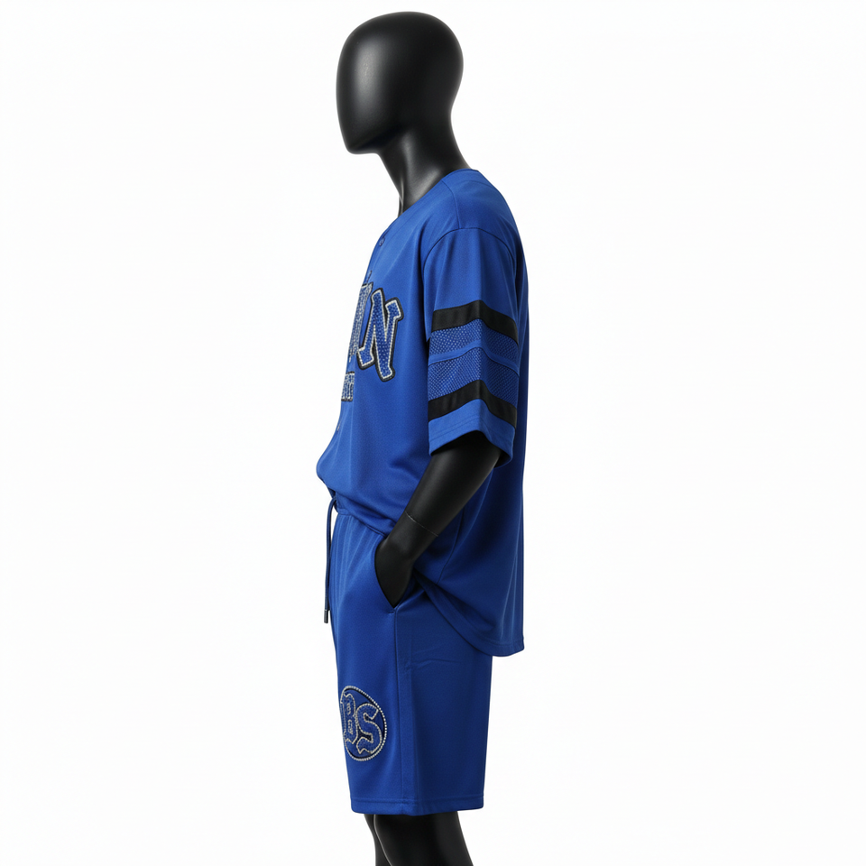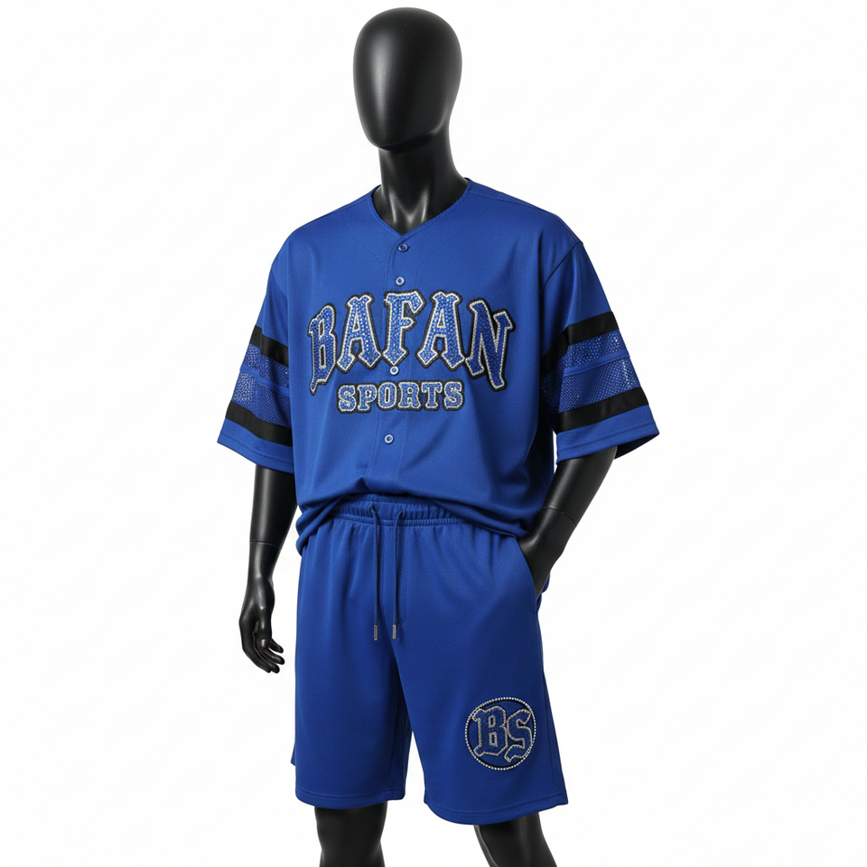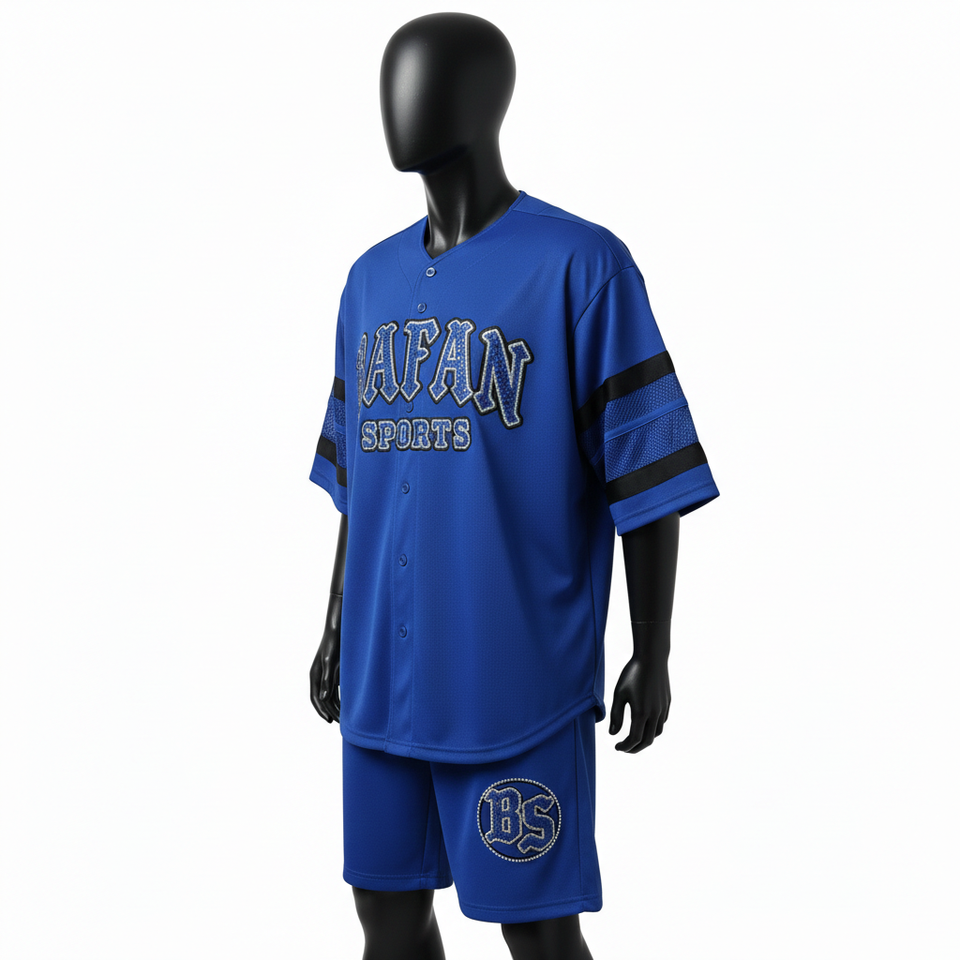 ชุดกางเกงเบสบอลชายพรีเมียม ผ้าโพลีเอสเตอร์ตาข่ายสีน้ำเงิน ดีไซน์แขนเสื้อแบบแผง พร้อมปักลายตามสั่ง สำหรับชุดกางเกงขาสั้นผู้ชาย
