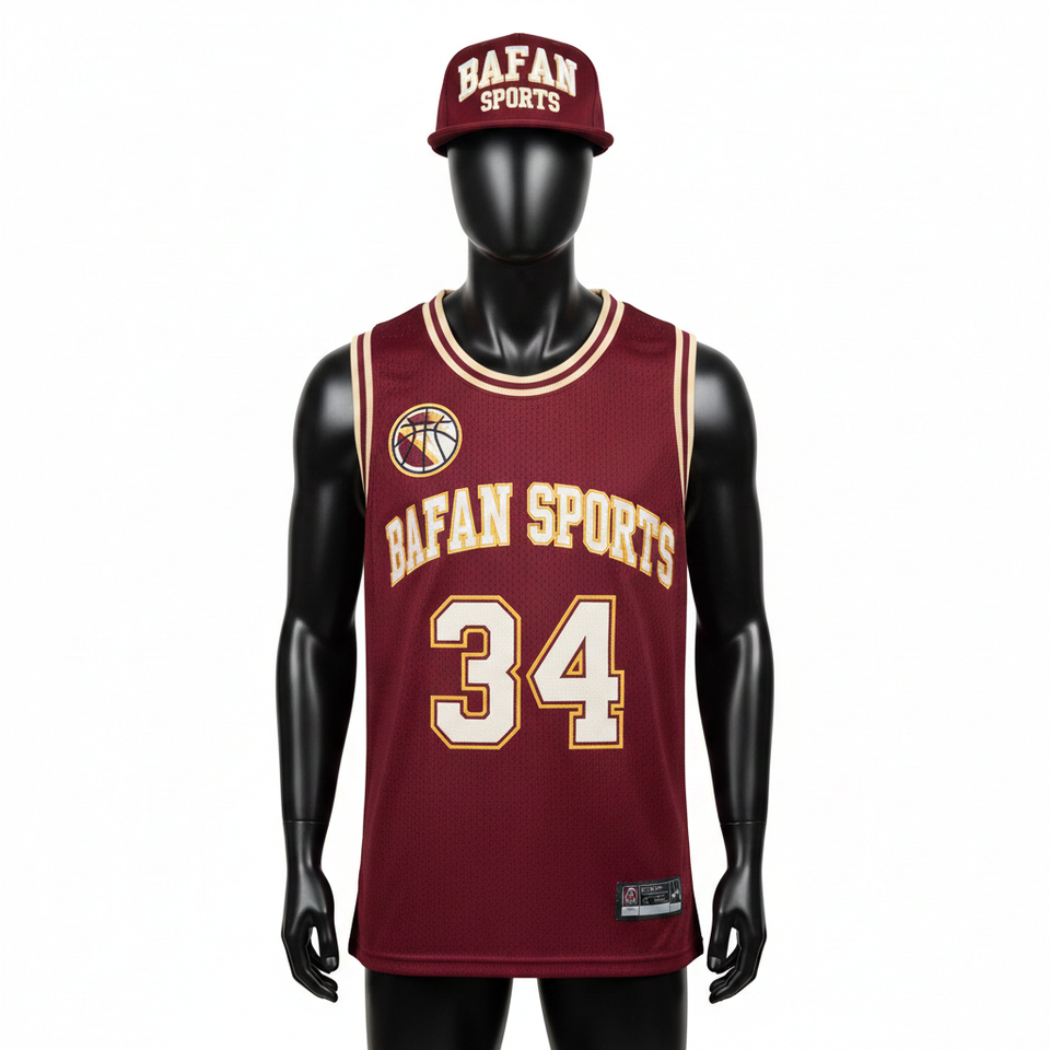 เสื้อบาสเก็ตบอลชาย ผ้าโพลีเอสเตอร์ตาข่ายระบายอากาศ 180 GSM สีแดงอมน้ำตาล แถบข้างสีทอง ปักโลโก้แบบรีดร้อน ผ้าทอลายทแยง เสื้อผู้ชาย