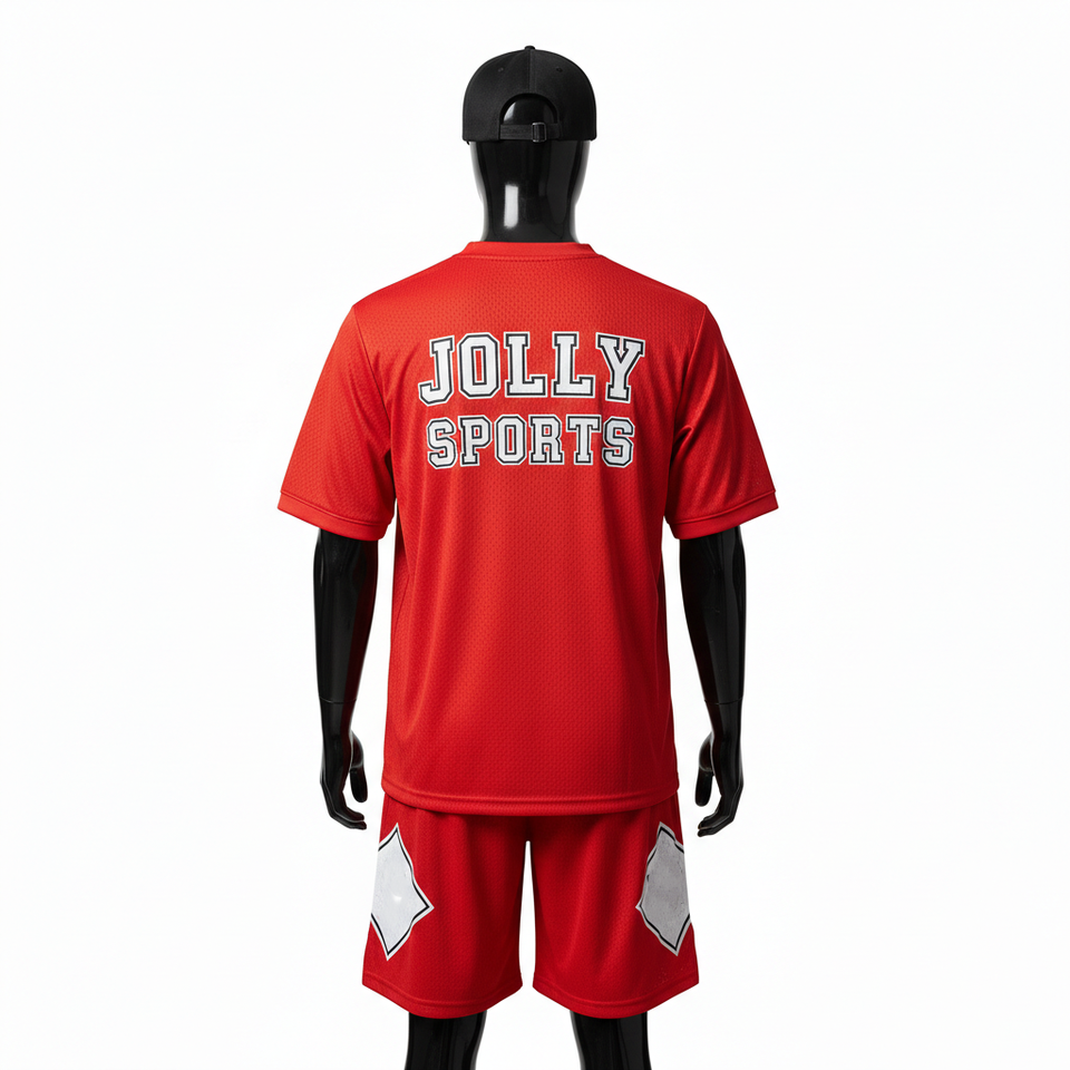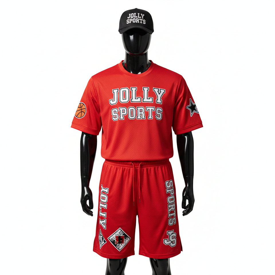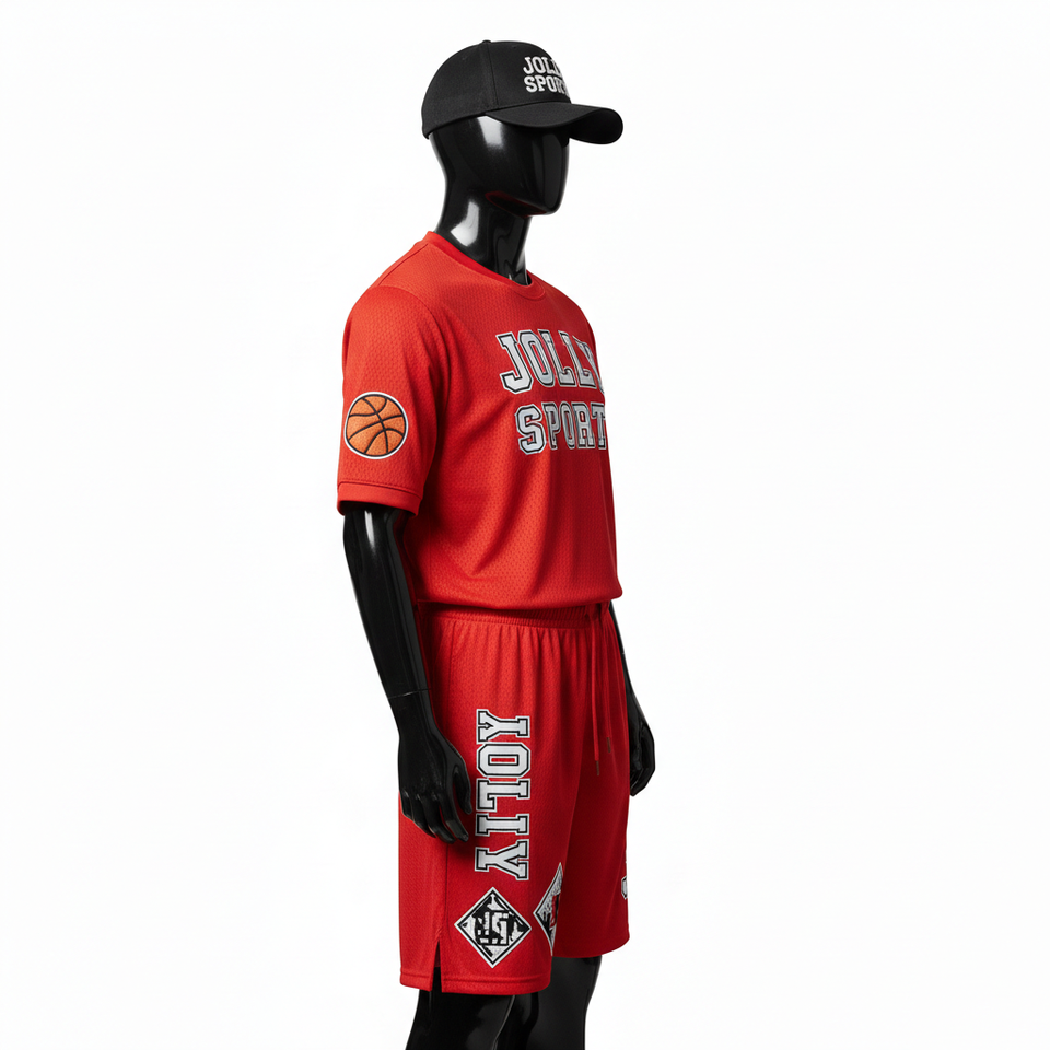 ชุดบาสเก็ตบอลชายพรีเมียม ผ้าโพลีเอสเตอร์ตาข่าย 180 GSM ระบายอากาศได้ดี สีแดง ออกแบบโลโก้ได้ตามต้องการ ชุดสำหรับผู้ชาย