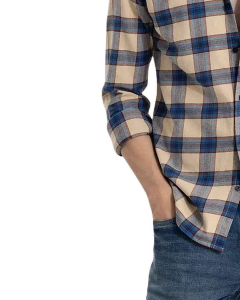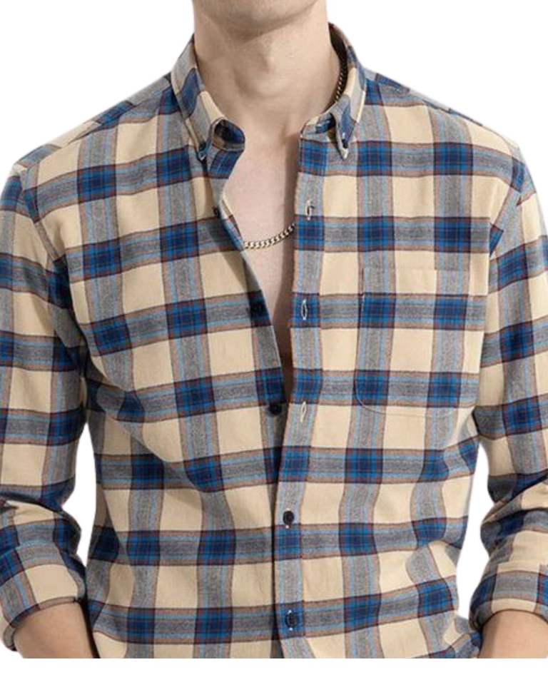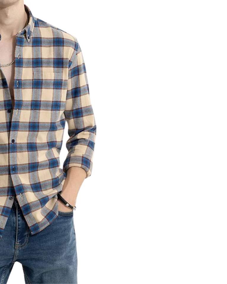 เสื้อเชิ้ตผู้ชายสีเบจและสีน้ำเงินลายสก็อต ผ้าฝ้าย แขนยาว ติดกระดุม ลำลอง ทรงพอดีตัว ผลิตตามสั่งจากโรงงาน OEM คุณภาพพรีเมียม สำหรับส่งออก