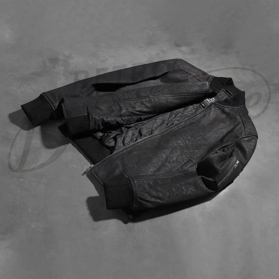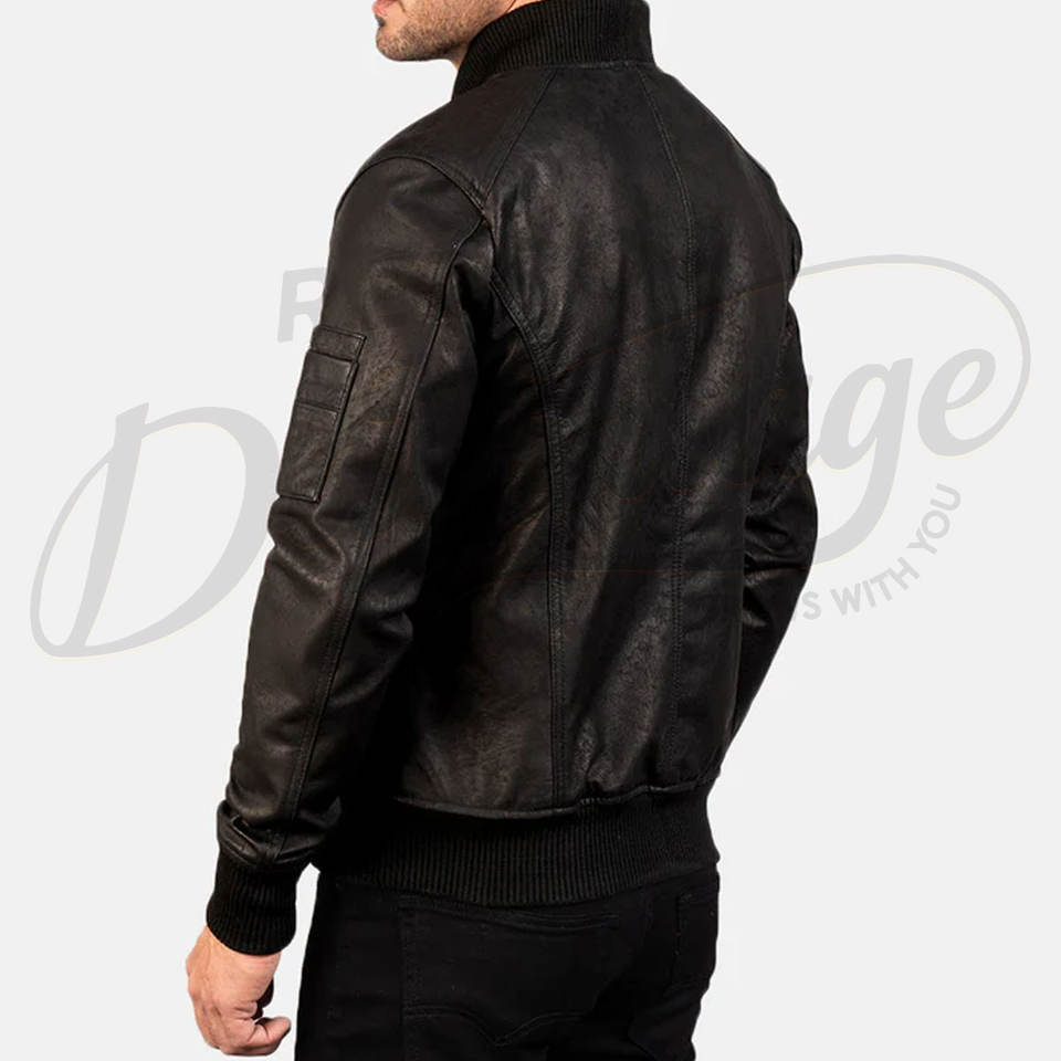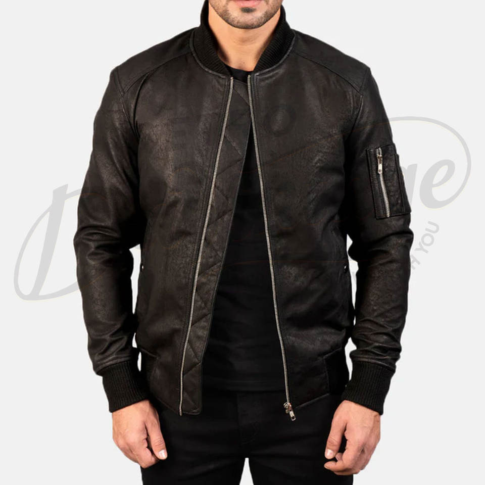 Men Black Distressed Genuine Leather MA-1 Bomber Jacket with Utility Sleeve Pocket and Ribbed Trim