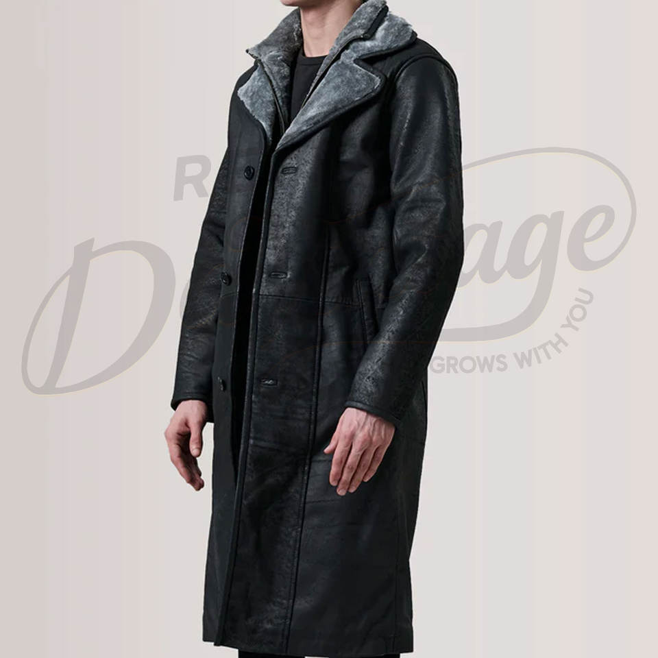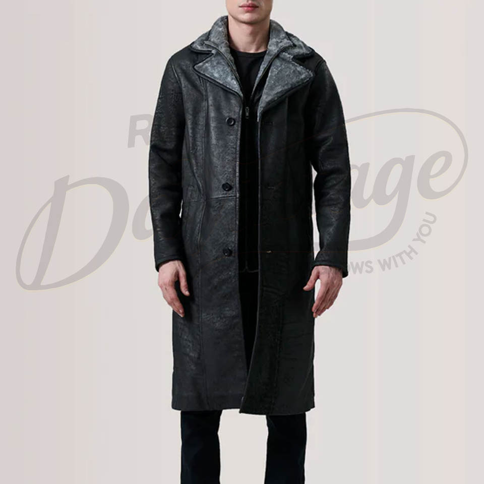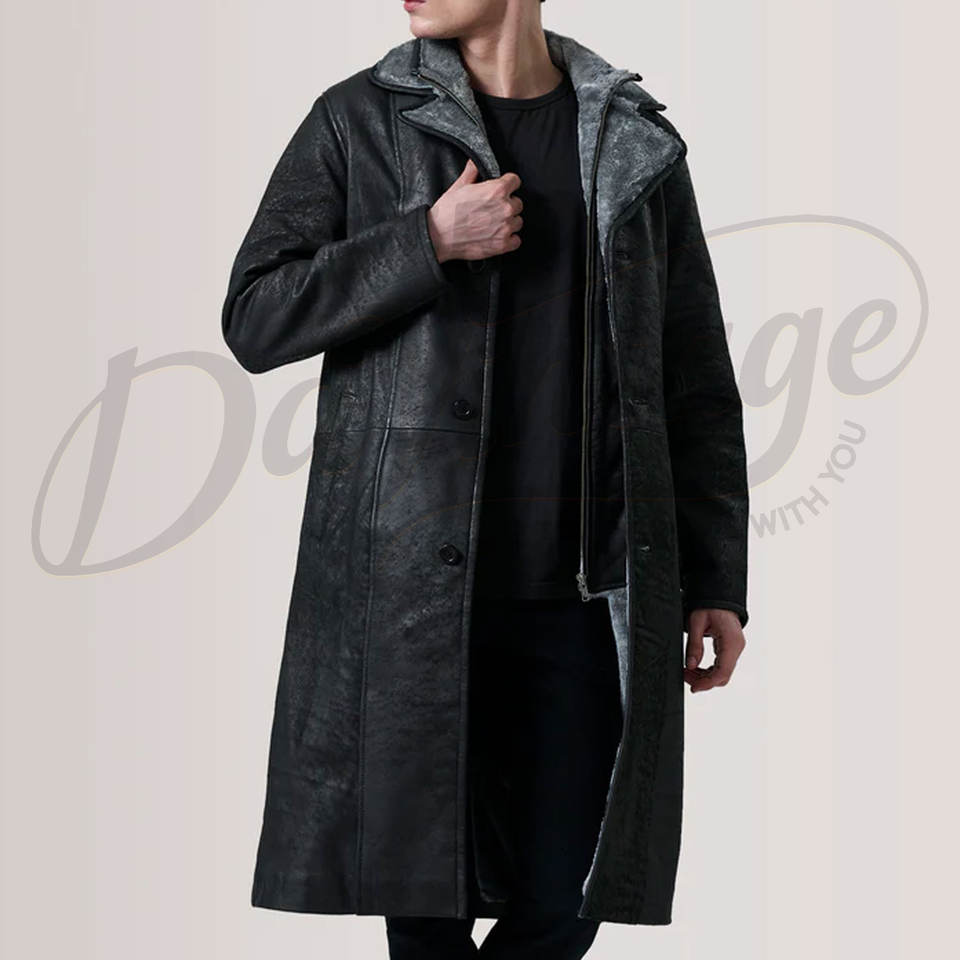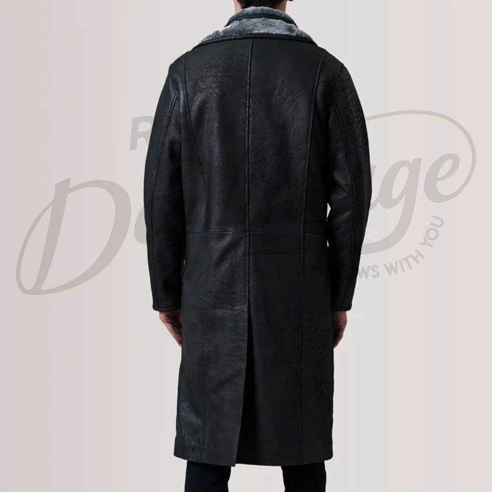 เสื้อโค้ทหนังแท้สีดำสำหรับผู้ชาย พร้อมซับในขนสัตว์สีเทา เสื้อคลุมยาวกันหนาวทรงเข้ารูป ทำจากหนังแกะ