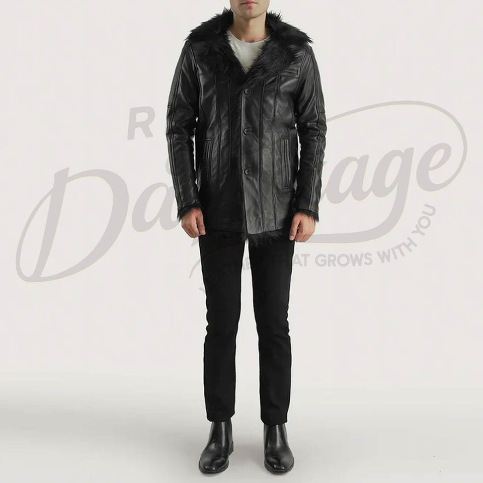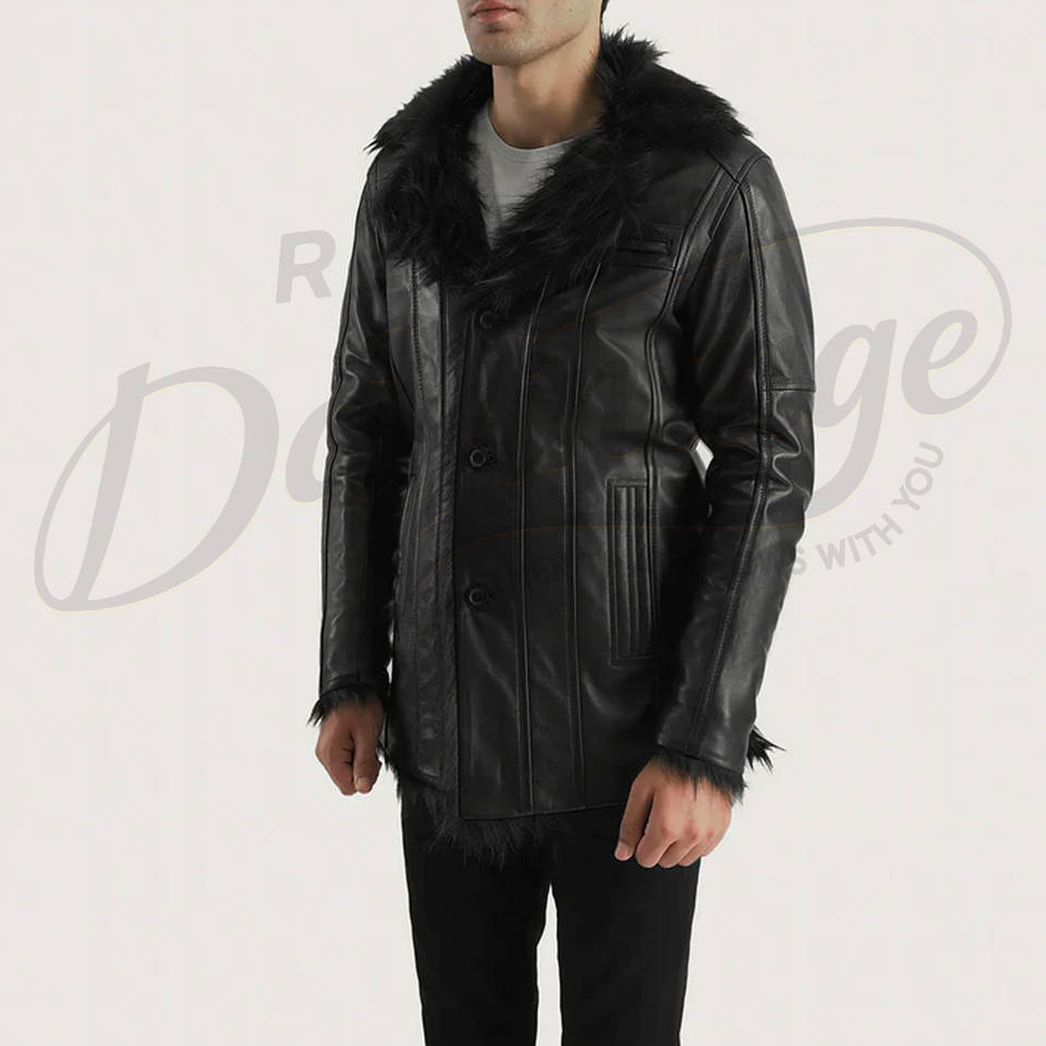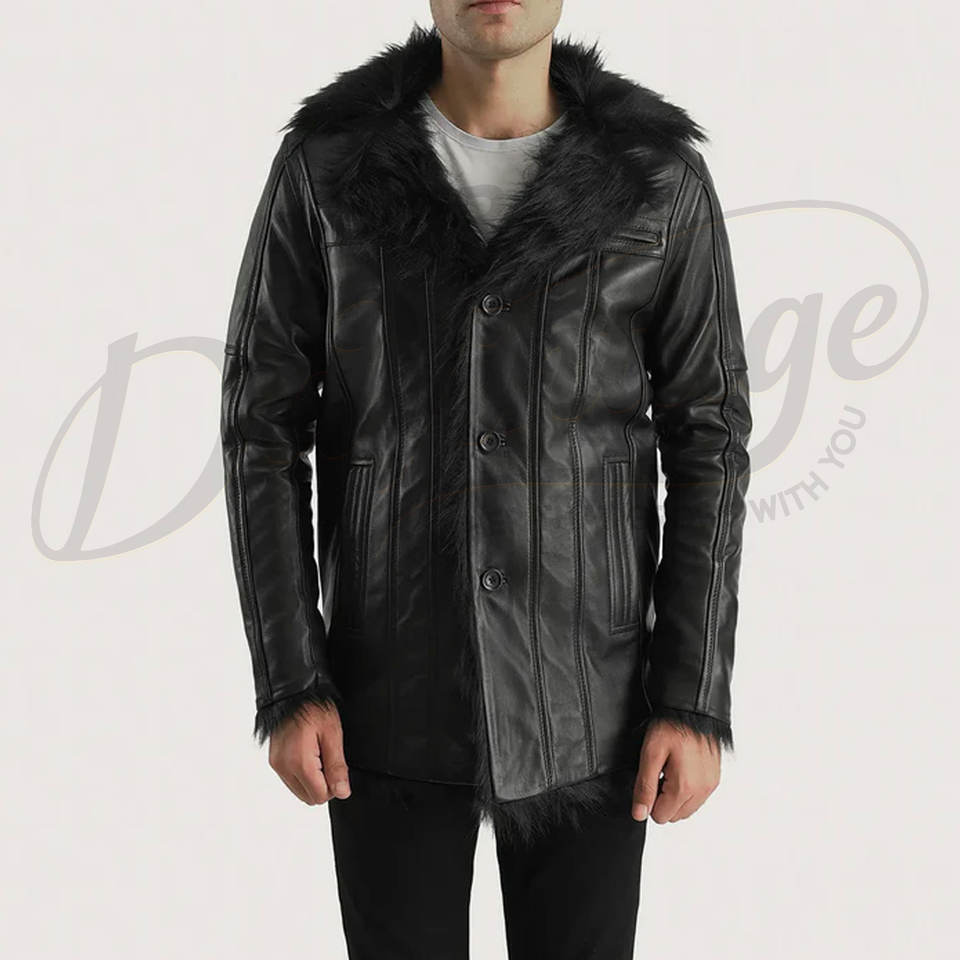 เสื้อโค้ทหนังสีดำสำหรับผู้ชาย พร้อมปกขนสัตว์เทียม สไตล์เชอร์ลิงสำหรับฤดูหนาว แจ็คเก็ตตัวยาวทรงเข้ารูป สวมใส่ได้ทั้งลำลองและธุรกิจ