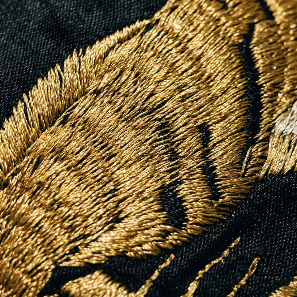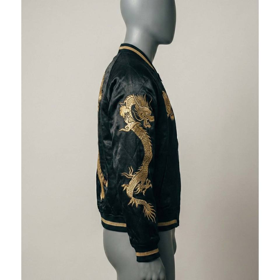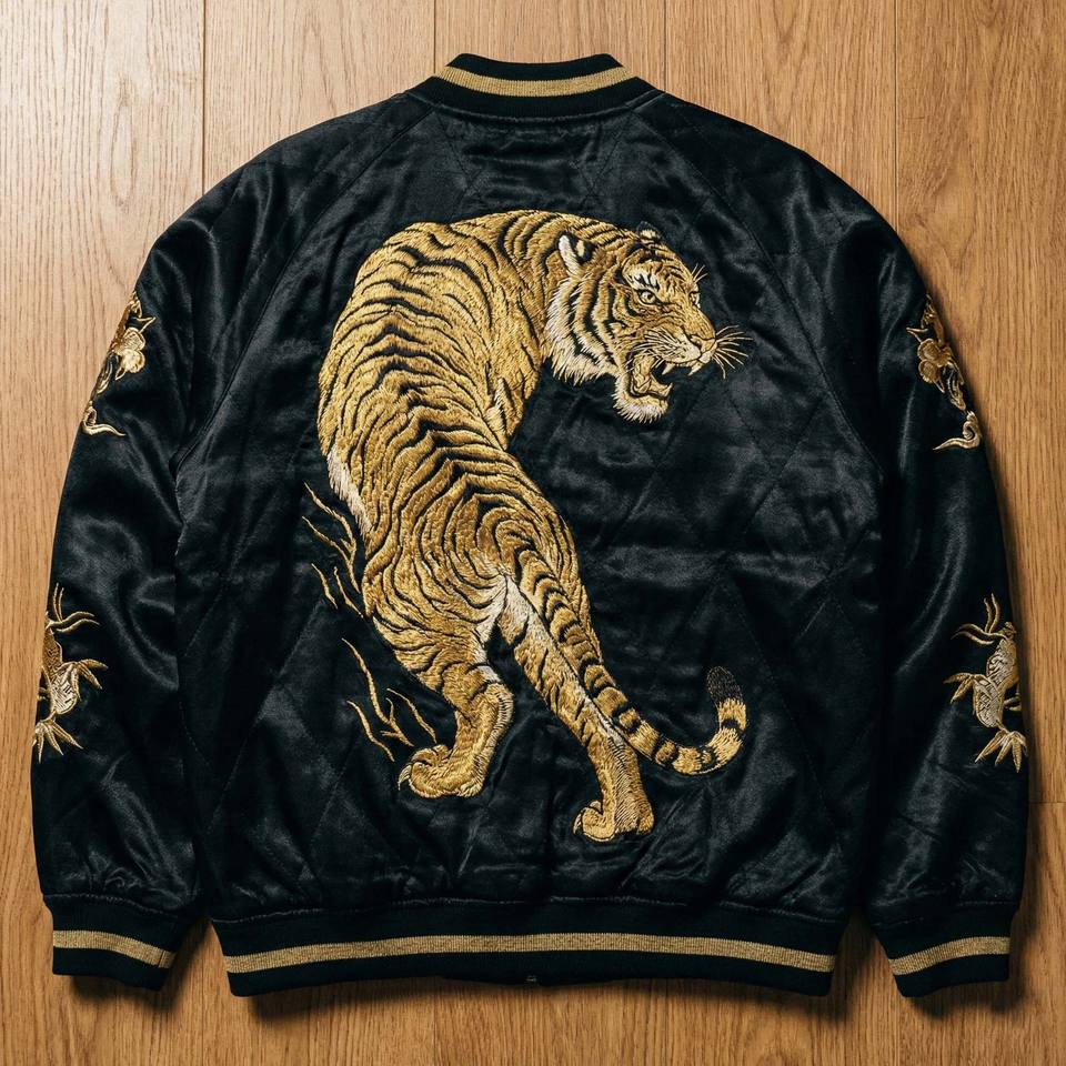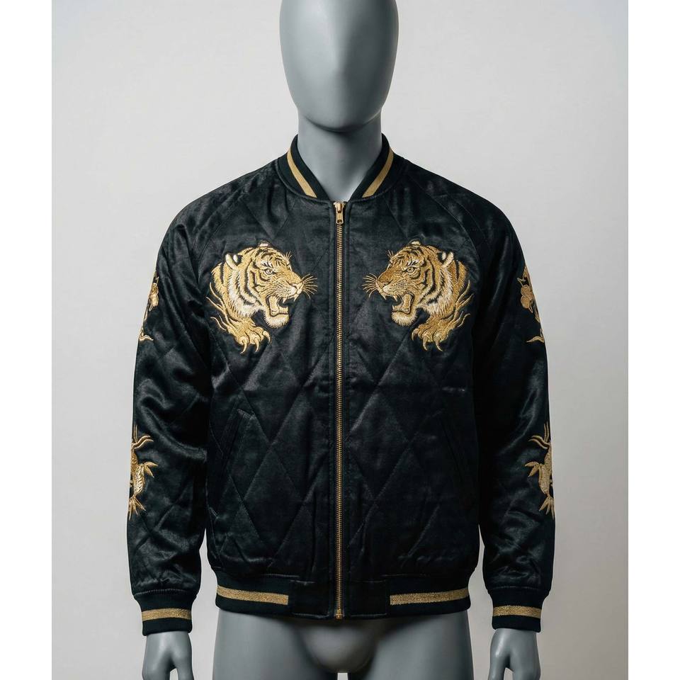 เสื้อแจ็คเก็ตซูกะจังผ้าซาตินสีดำสำหรับผู้ชาย สไตล์วินเทจญี่ปุ่น ปักลายเสือสีทอง เสื้อโค้ทบอมเบอร์แบบเย็บติดกัน สตรีทแวร์ เสื้อแจ็คเก็ตของที่ระลึก