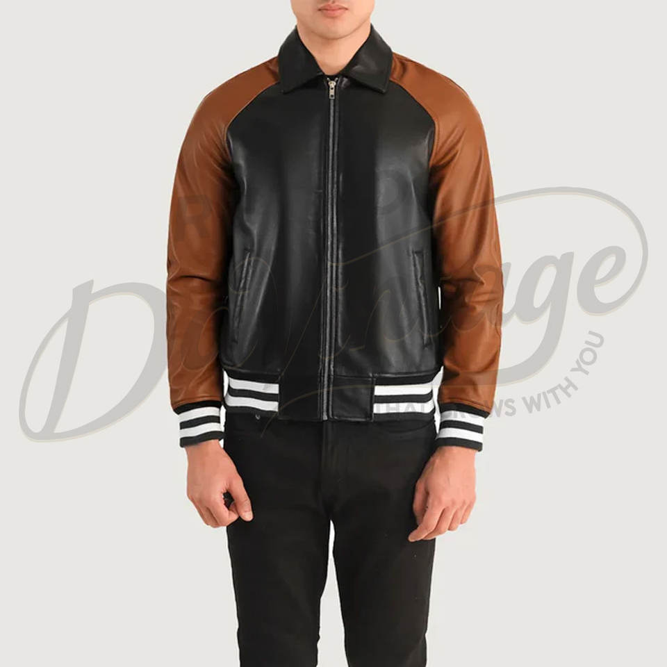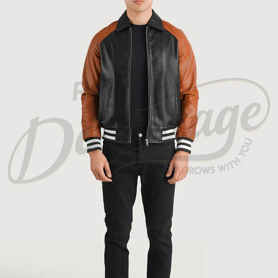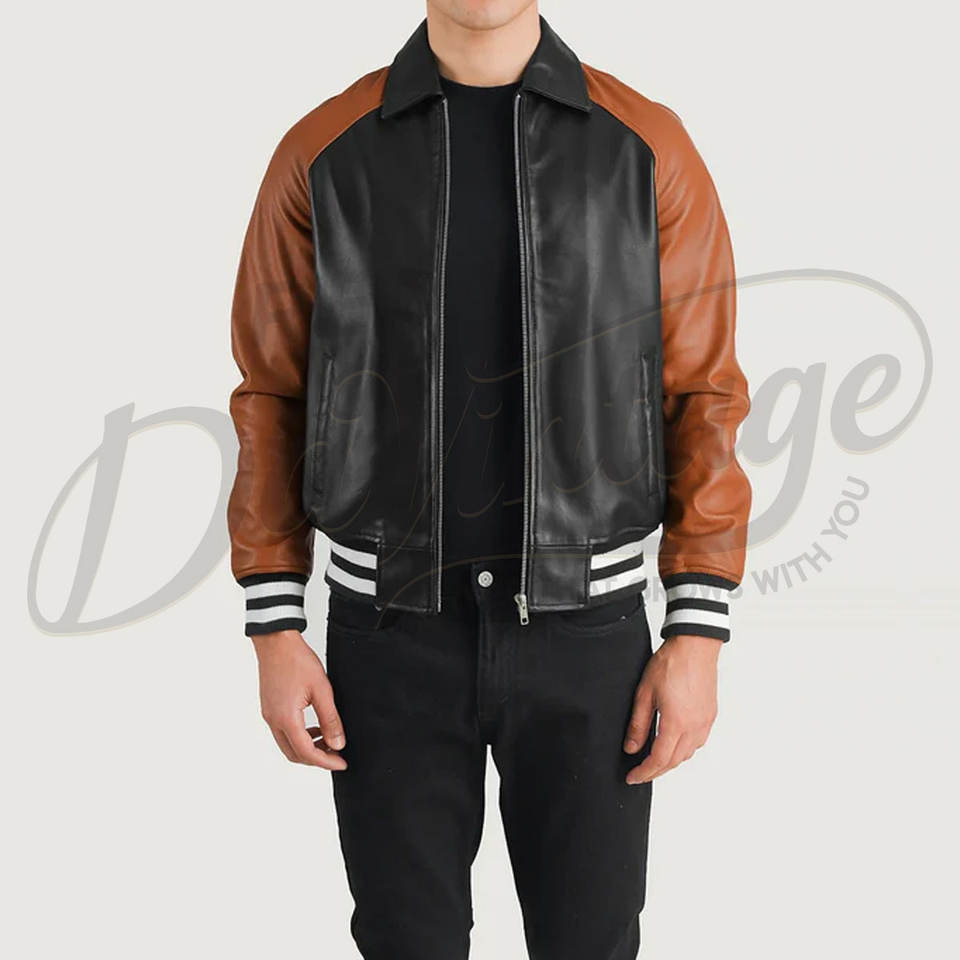 เสื้อแจ็คเก็ตบอมเบอร์หนังสองสีดำและน้ำตาลสำหรับผู้ชาย พร้อมปกเสื้อเชิ้ตแบบคลาสสิกและปลายแขนเสื้อแบบริบแถบลาย