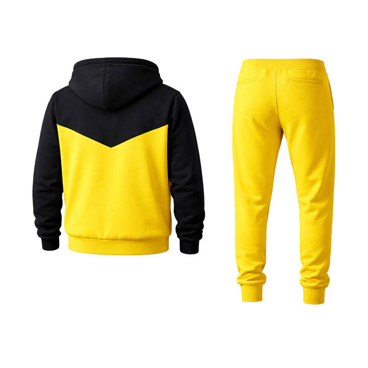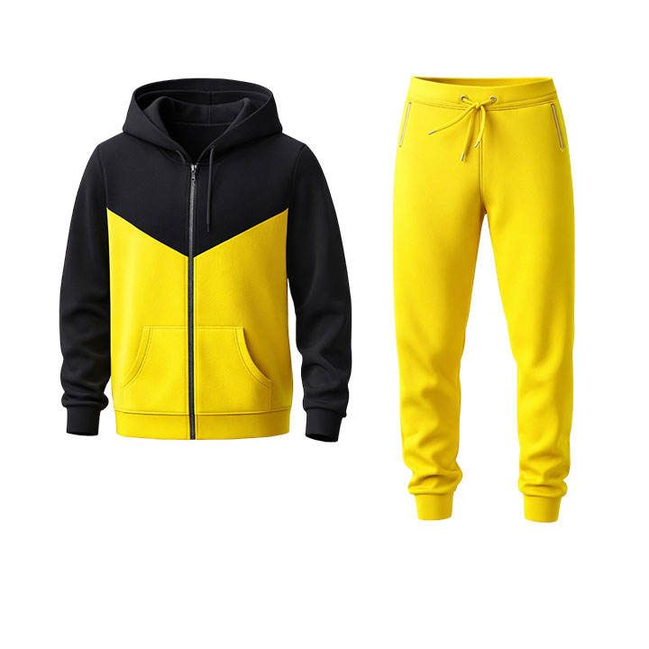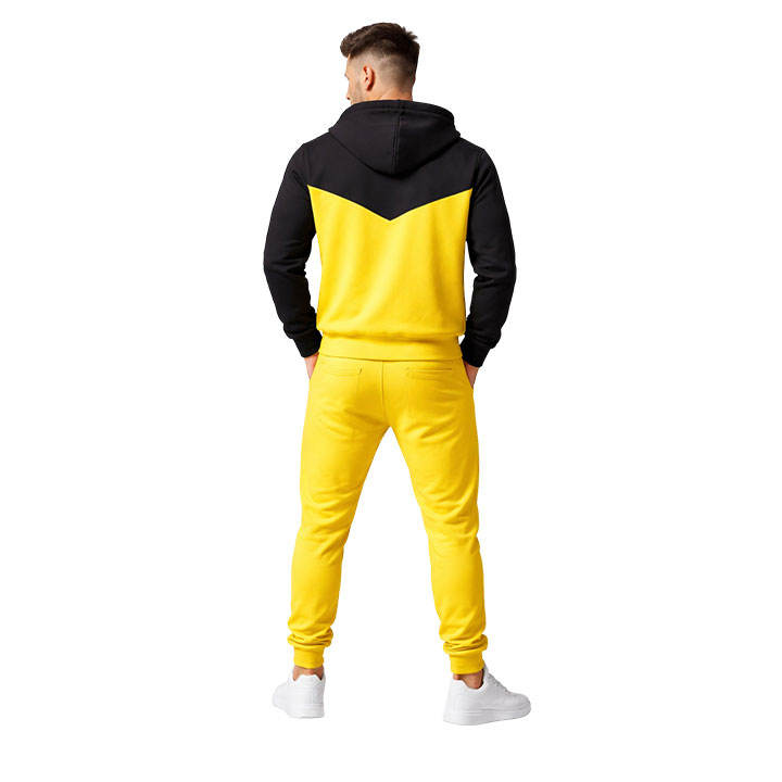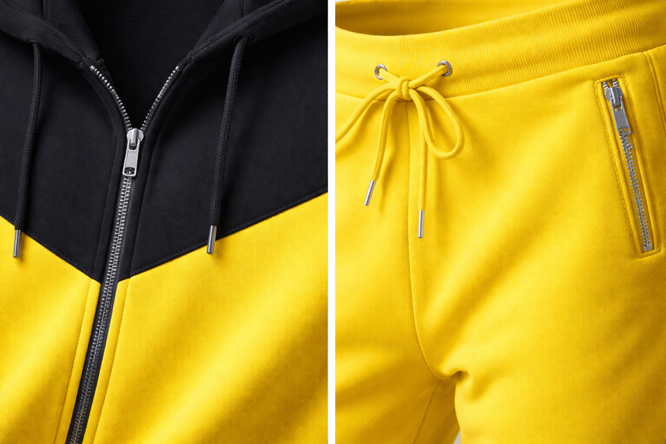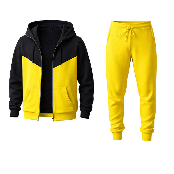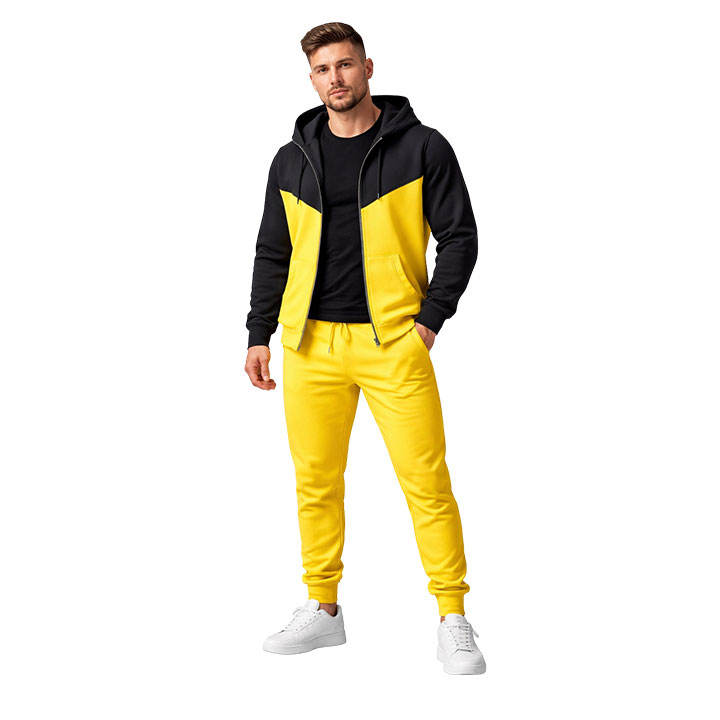ชุดวอร์มผู้ชายสีดำและสีเหลือง เสื้อฮู้ดซิปพร้อมกางเกงจ็อกเกอร์ ทรงเข้ารูป สวมใส่สบาย เหมาะสำหรับออกกำลังกาย วิ่ง และเล่นกีฬา