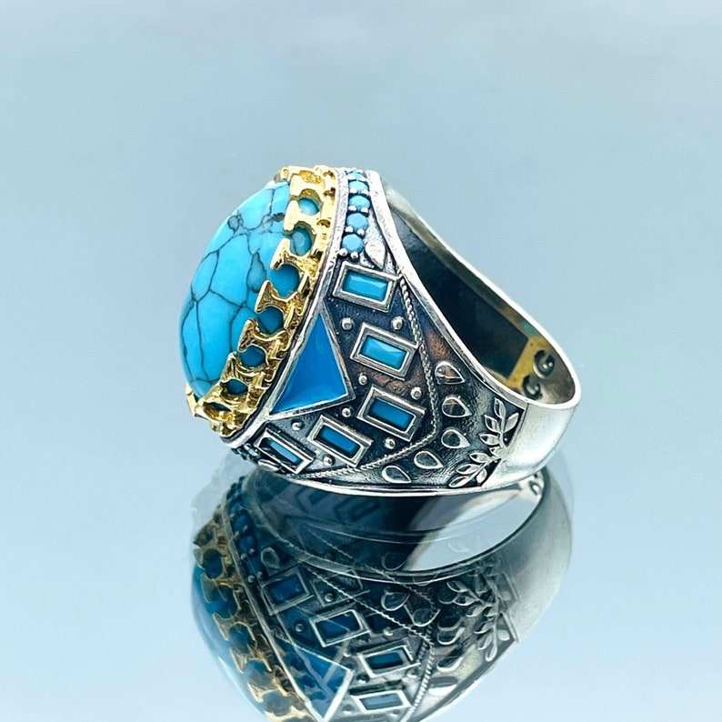 แหวนหินรูปไข่สีเงิน925สำหรับผู้ชายสีฟ้าเทอร์ควอยซ์ให้ความร้อนสำหรับของขวัญวันเกิดหรืองานครบรอบเครื่องประดับเงินของผู้ชาย