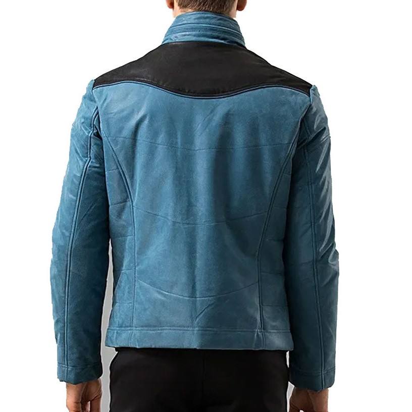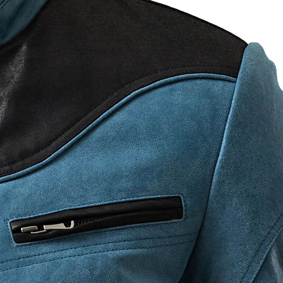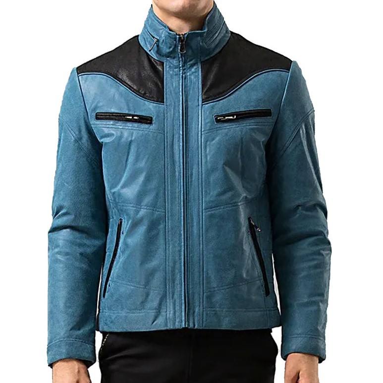 Men Blue and Black Leather Jacket Stylish Motorcycle Biker Coat with Zipper Pockets and Stand Collar New Design
