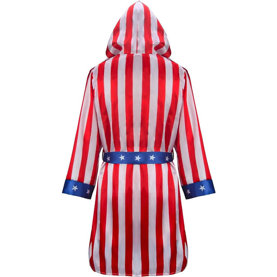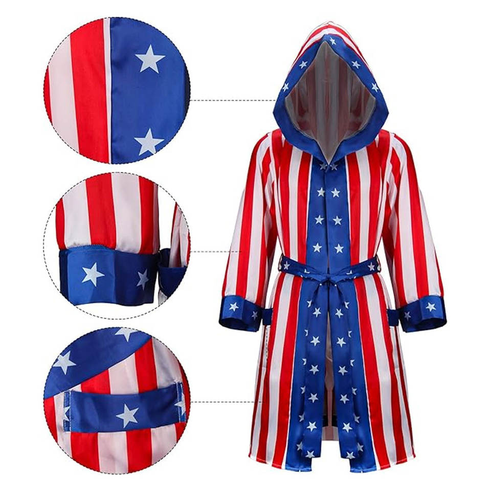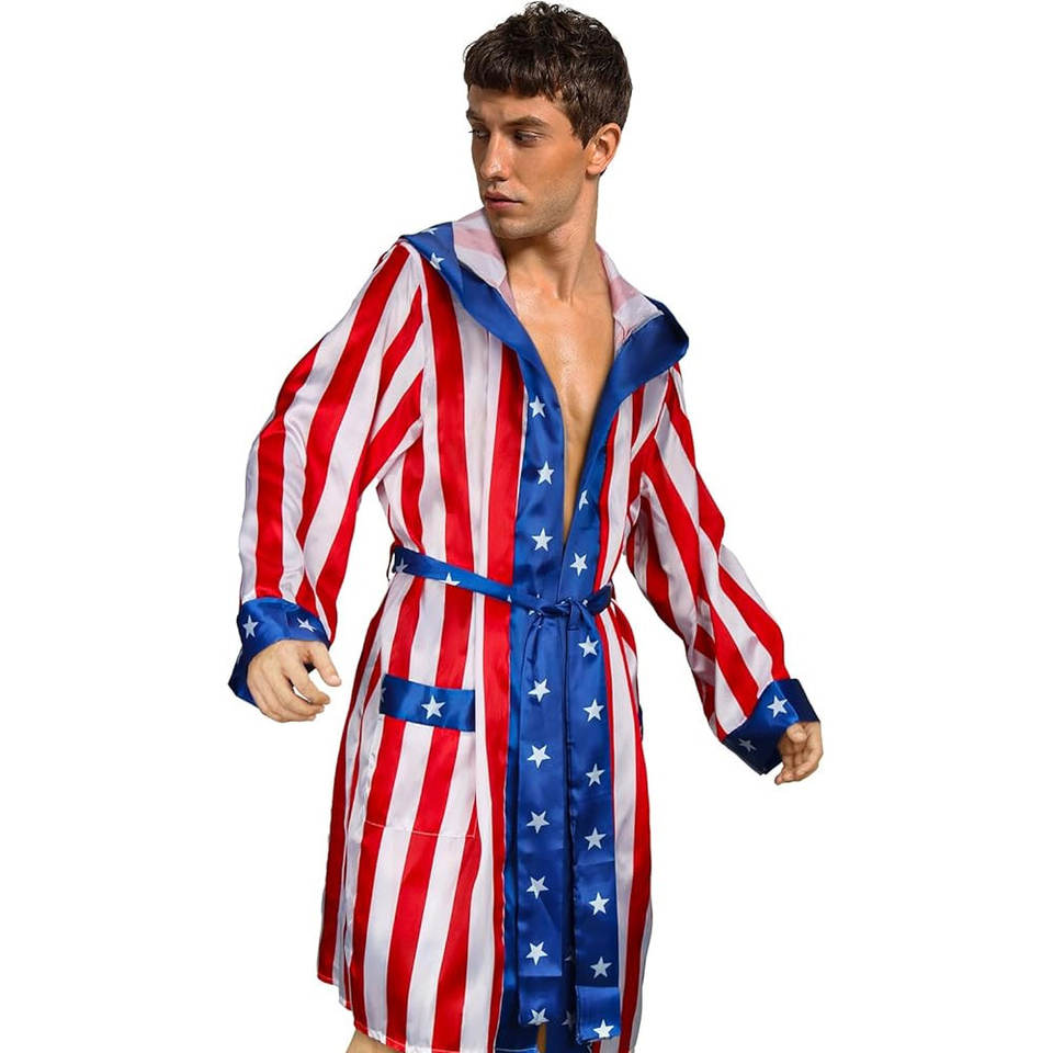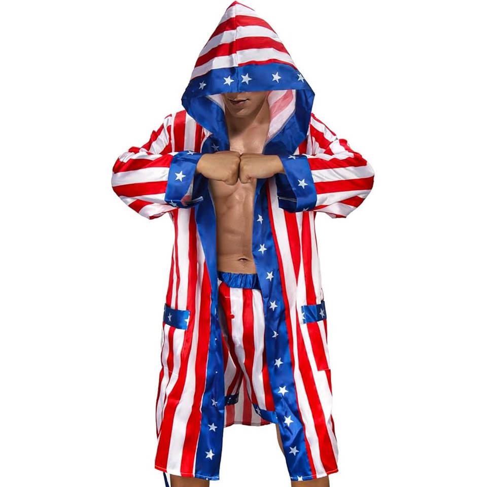 ชุดนักมวยชายผ้าซาตินลายธงชาติอเมริกันพร้อมฮู้ด กางเกงขาสั้น เข็มขัด และผ้าคลุม ชุดคอสเพลย์ฮาโลวีน ชุดนักสู้แชมป์เปี้ยน