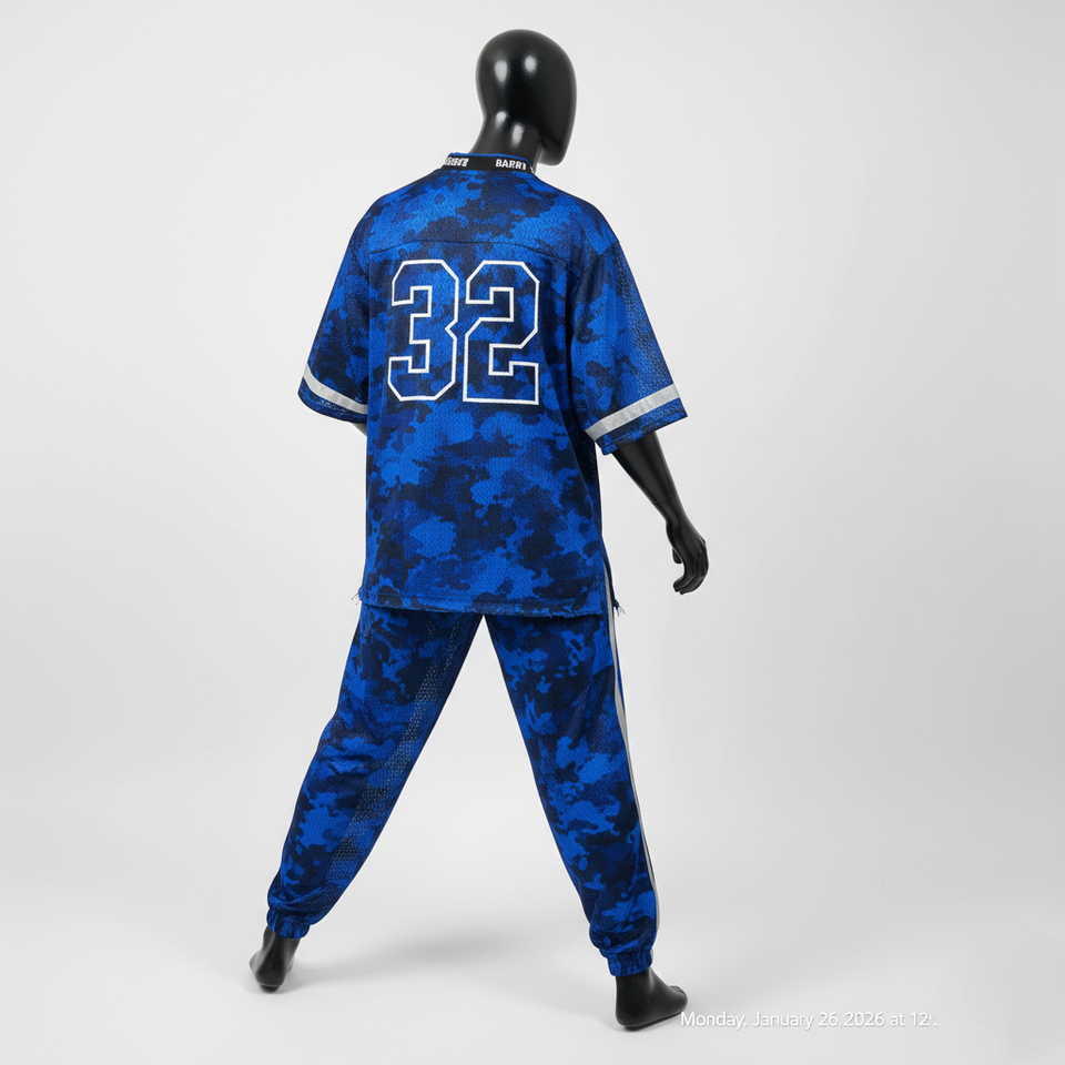 ชุดกางเกงเจอร์ซีย์ตาข่ายโพลีเอสเตอร์ระบายอากาศสำหรับผู้ชาย 180 GSM สีน้ำเงินดำลายพรางด้านข้าง พร้อมโลโก้แบบซับลิเมชั่นสั่งทำพิเศษ ชุด 2 ชิ้น สำหรับผู้ชาย