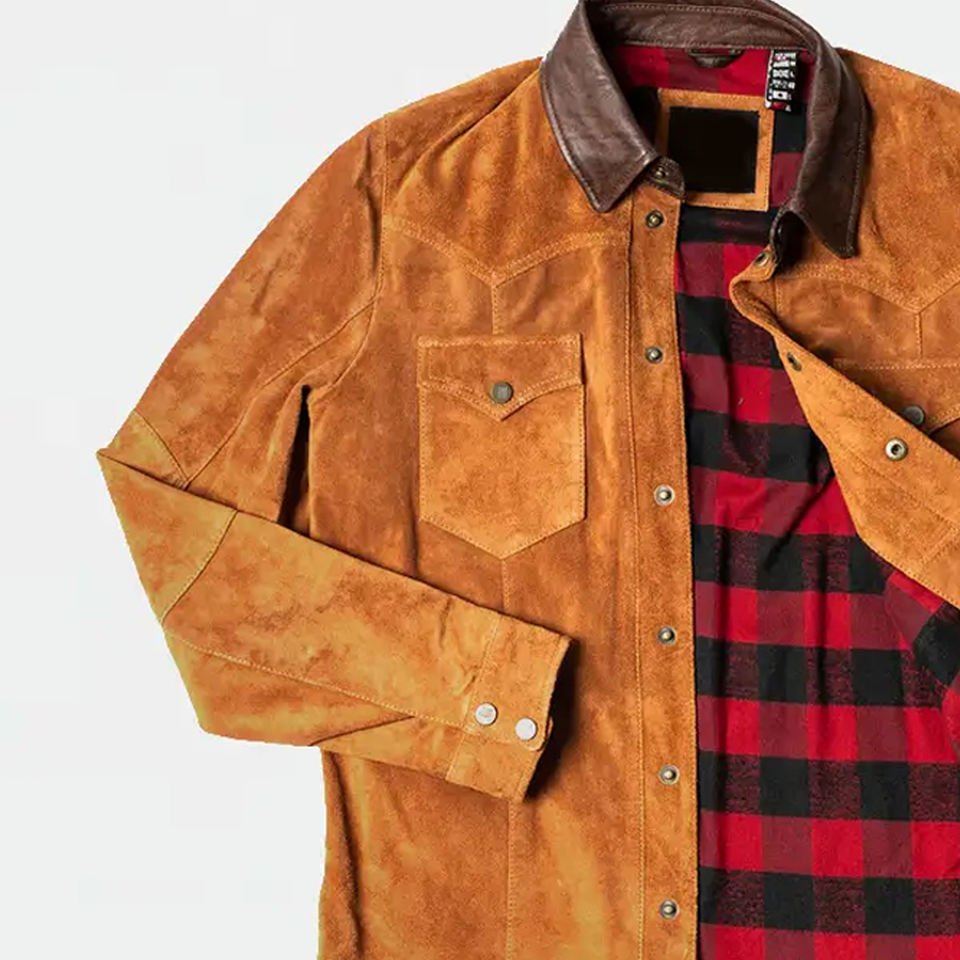 แจ็กเก็ตหนังคาวบอยขอบสีน้ำตาลสำหรับผู้ชายแจ็คเก็ตหนังกลับวัวแท้สไตล์ตะวันตกแบบดั้งเดิมสีน้ำตาล