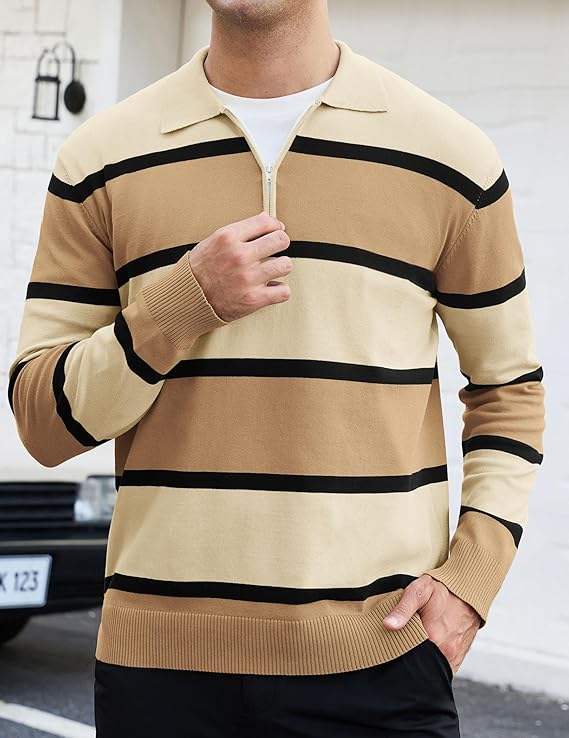 เสื้อโปโลลำลองผู้ชายลายทางวินเทจ เสื้อกอล์ฟถัก เสื้อรักบี้ เสื้อโปโลน้ำหนักเบา