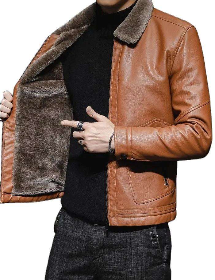 เสื้อแจ็คเก็ตหนังผู้ชายทรงคลาสสิค คอวี กันน้ำ กันลม อุ่นสบายสำหรับฤดูใบไม้ร่วง มีกระเป๋าซิปด้านข้างแบบแน่นหนา ด้านหน้ามีกระเป๋าซิป ผลิตตามแบบ OEM