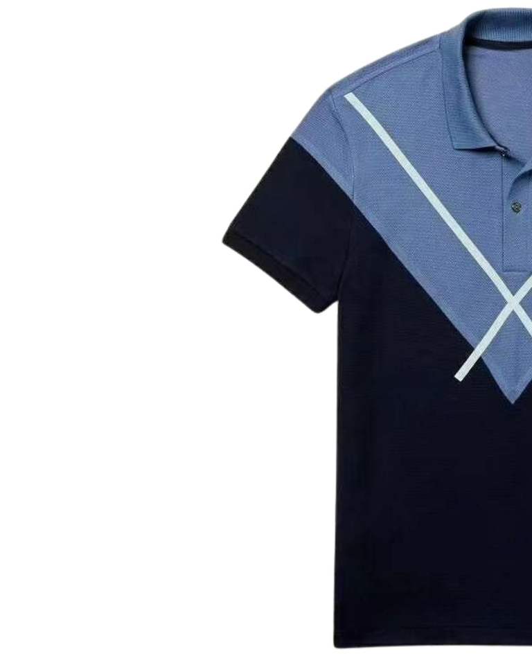 เสื้อโปโลผู้ชาย แขนสั้น ผ้าฝ้าย ลายบล็อกสี สไตล์ลำลอง เหมาะสำหรับตีกอล์ฟ สีฟ้า สีกรมท่า สีดำ ลายทางเรขาคณิต เสื้อผ้าฤดูร้อน เสื้อผู้ชาย