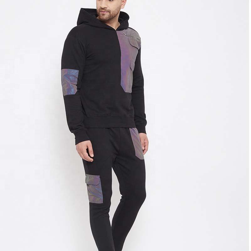 ชุดวอร์มเต็มตัวของผู้ชายสีดำสีรุ้ง, ชุดวอร์มกางเกงปะติดสะท้อนแสงสีรุ้งมีฮู้ดสำหรับฤดูหนาวสีดำ rainbo