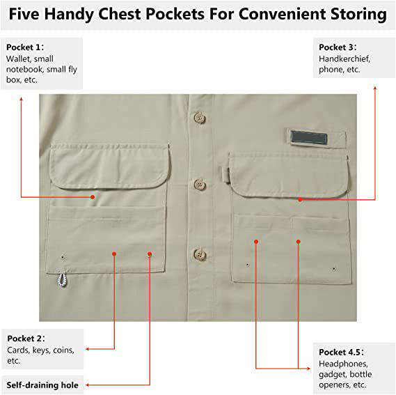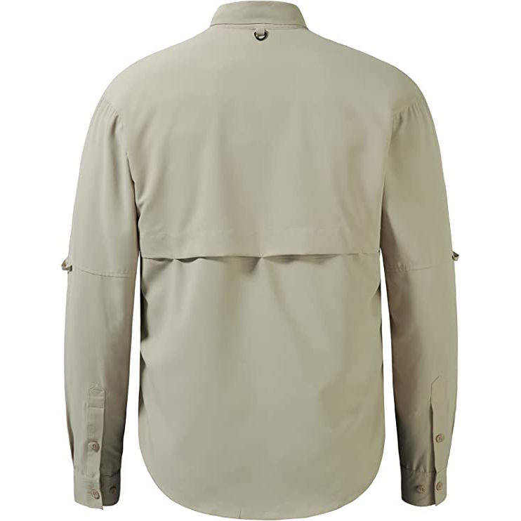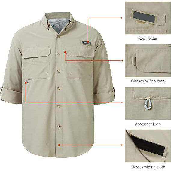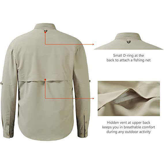 เสื้อตกปลาแขนพับได้สำหรับผู้ชาย, เสื้อตกปลามีกระดุมด้านหลังมีช่องระบายอากาศสำหรับใส่ทำกิจกรรมกลางแจ้งผ้าสแปนเด็กซ์โพลีเอสเตอร์ UV 50 +