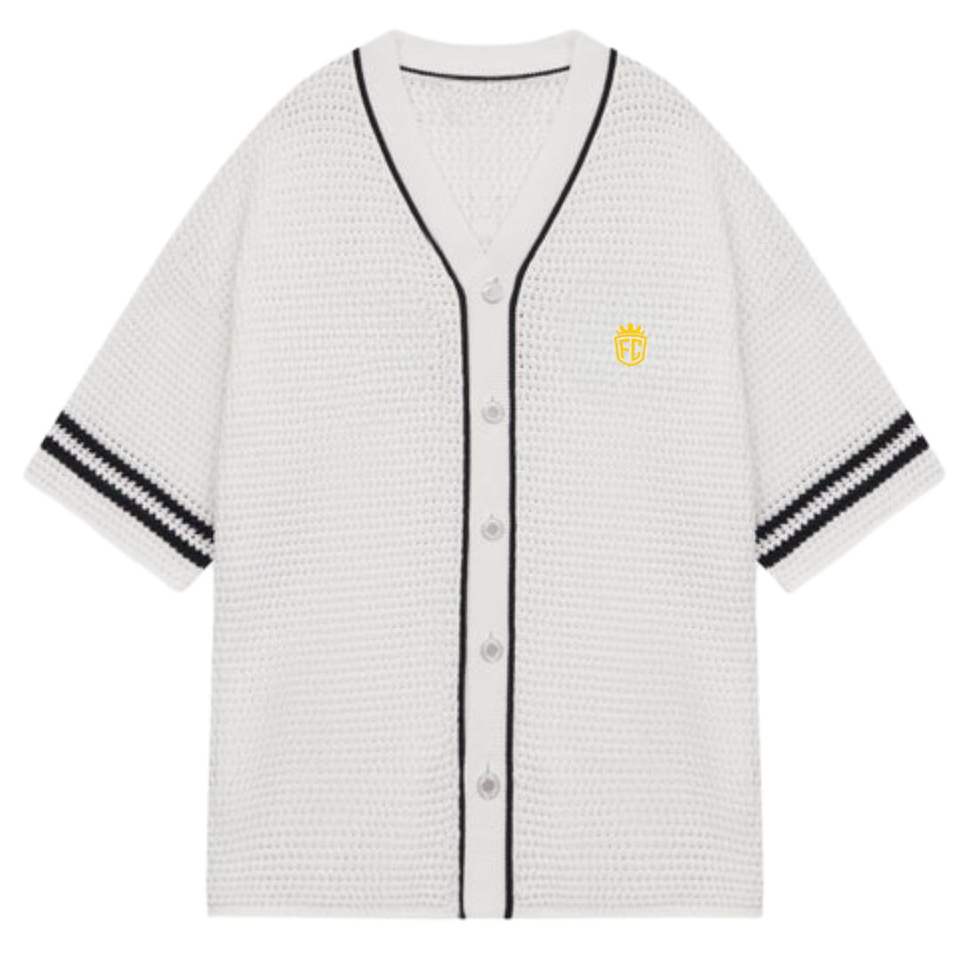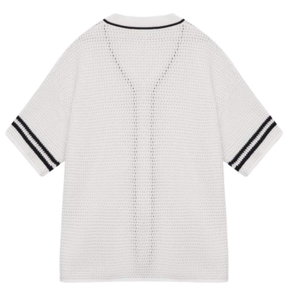 เสื้อเบสบอลถักโครเชต์สำหรับผู้ชาย แขนสั้น ติดกระดุม แต่งลายทาง สไตล์ลำลอง เสื้อถักฤดูร้อน รับผลิตแบบ OEM ขายส่ง
