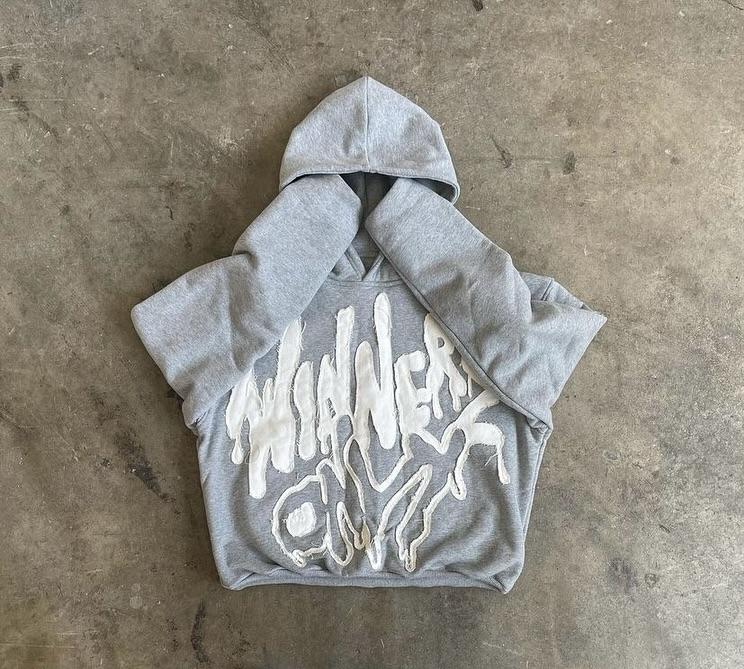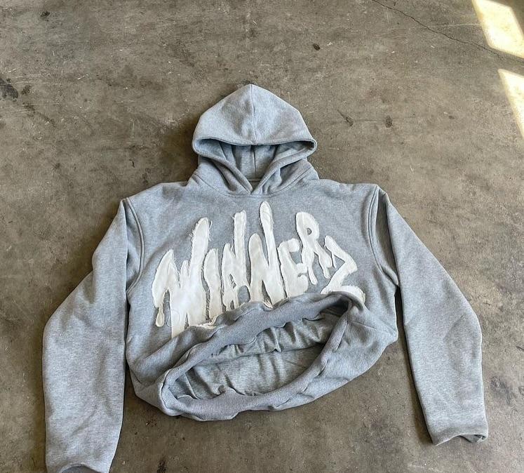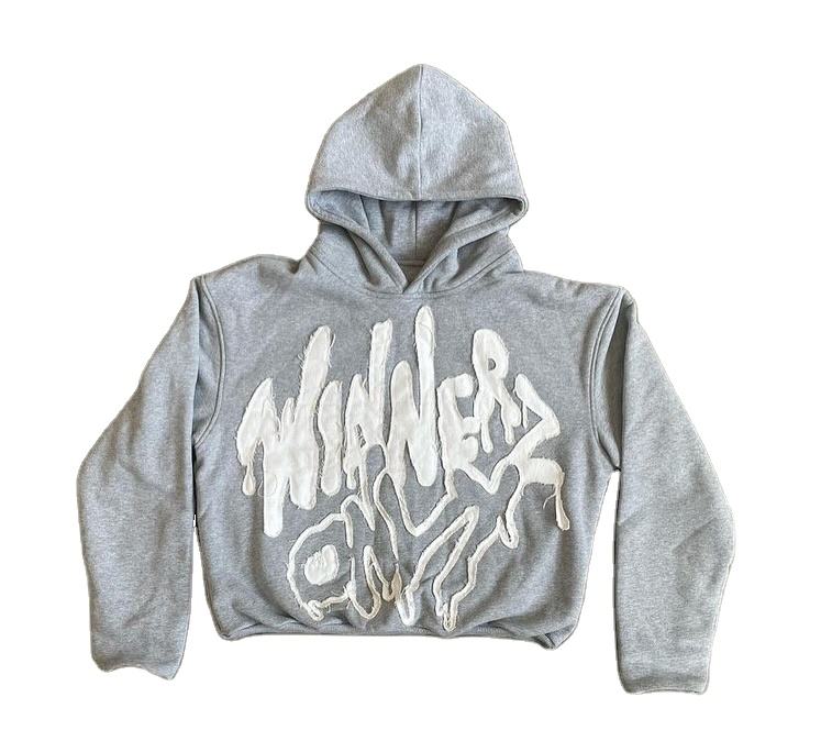 เสื้อฮู้ดดี้พิมพ์ลายพัฟฟ์สีเทาแบบหนาสำหรับผู้ชาย รุ่น Winners Only สไตล์สตรีทแวร์ทรงโอเวอร์ไซส์ ผ้าฟลีซ