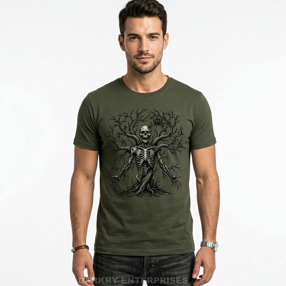 เสื้อยืดผู้ชายลายกราฟิกโครงกระดูกต้นไม้ พิมพ์ลายคุณภาพสูง ผ้าฝ้าย เสื้อผ้าสตรีทแวร์ เสื้อยืดผู้ชาย ผลิตจากโรงงาน