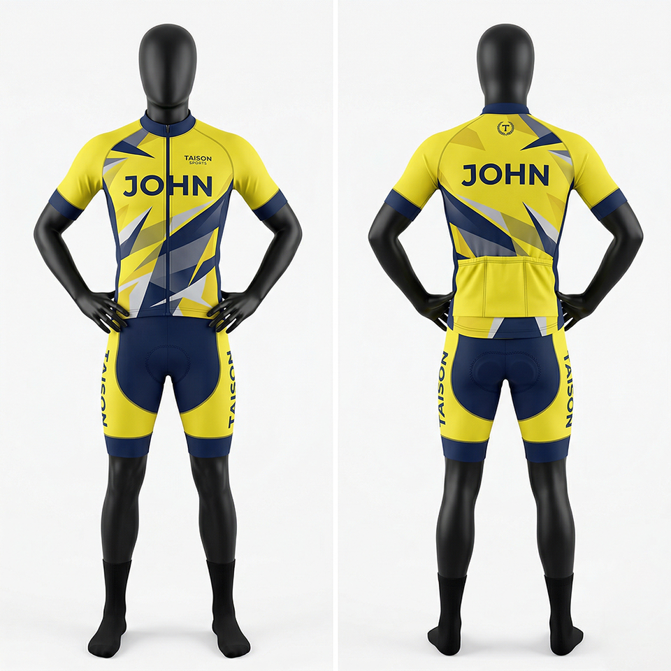 ชุดปั่นจักรยานผู้ชาย พรีเมียม 180 GSM โพลีเอสเตอร์ผสมสแปนเด็กซ์ ระบายอากาศ แห้งเร็ว สีเหลืองกรมท่า ดีไซน์แผงสี รับสกรีนโลโก้แบบซับลิเมชั่น
