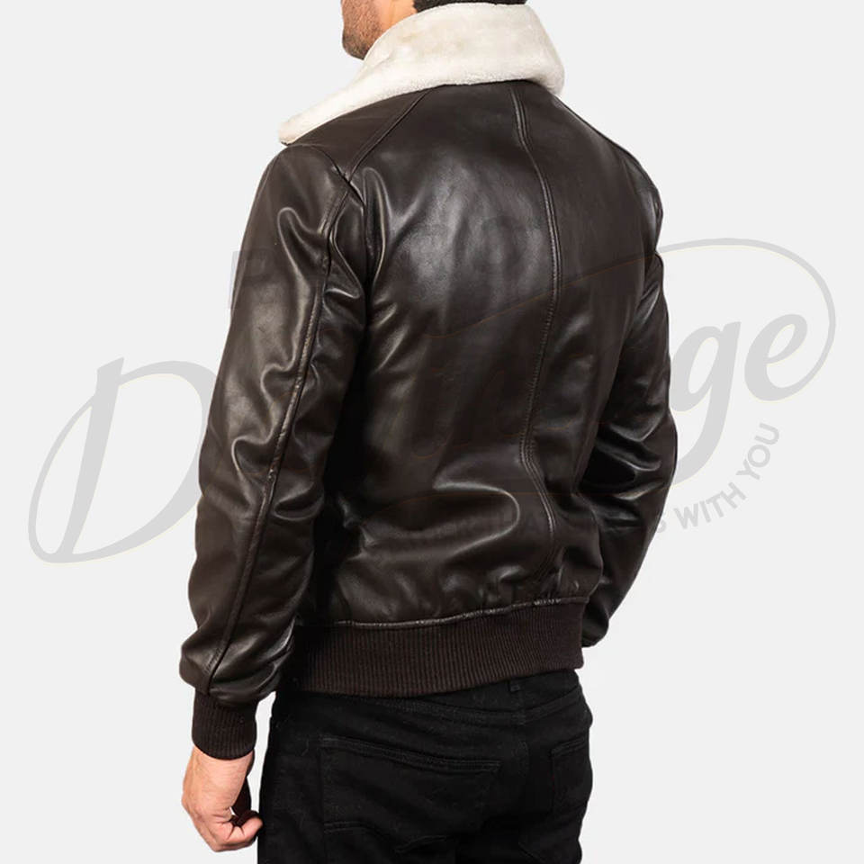 เสื้อแจ็คเก็ตนักบิน G-1 หนังแท้สีน้ำตาลเข้มสำหรับผู้ชาย คอปกขนสัตว์เทียมสีขาว กระเป๋าแบบฝาปิดคู่ ขอบแต่งริบบิ้น สไตล์นักบิน