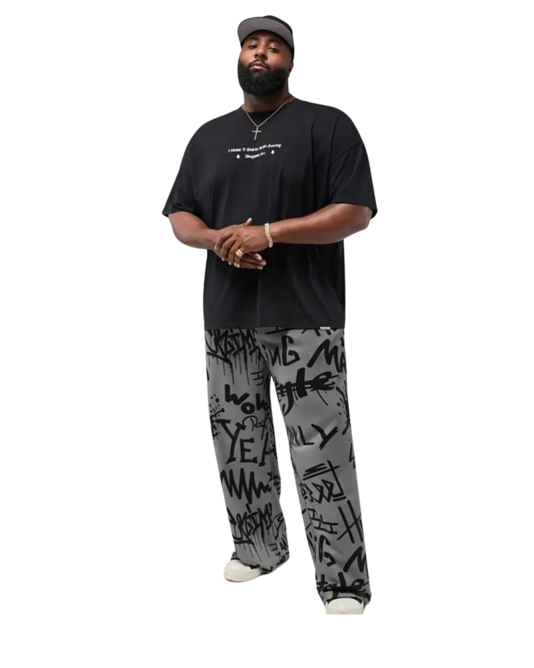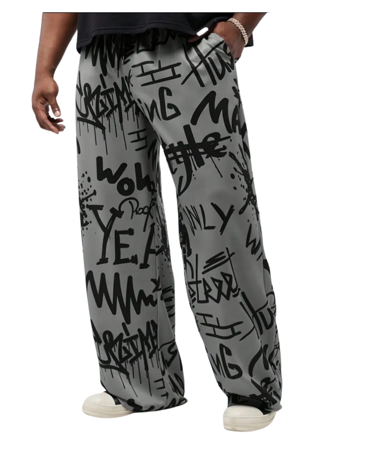 กางเกงลำลองทรงหลวมผูกเชือกลายกราฟฟิตี้สีเทาเข้มสำหรับผู้ชายสไตล์สตรีทพิมพ์ลายตัวอักษรสดใสผ้าไม่ยืดใส่สบาย