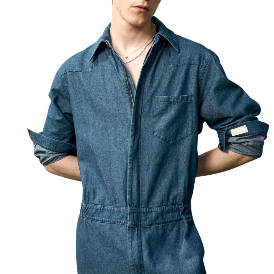 ชุดจั๊มพ์สูทเดนิมผู้ชายแบบมีซิป แขนยาว สำหรับงานหนัก ปรับได้ เหมาะสำหรับงานก่อสร้างและงานอุตสาหกรรม
