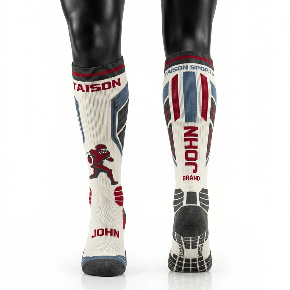 ถุงเท้าฟุตบอลชายคุณภาพสูง 300 GSM ผ้าฝ้ายหวีผสมไนลอน ระบายความชื้นได้ดี แผ่นยางยืดแบบริบ โลโก้ถักแบบกำหนดเอง
