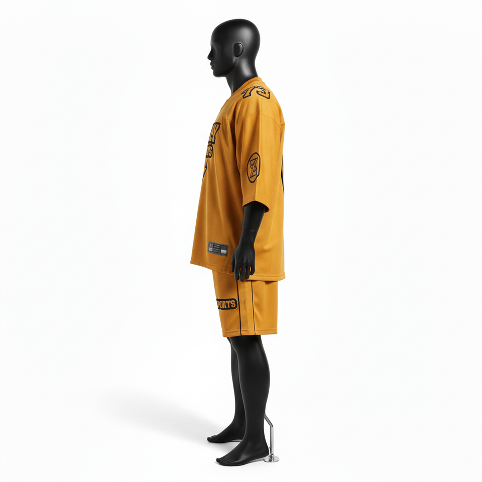ชุดเสื้อฟุตบอลชาย กางเกงขาสั้น ผ้าโพลีเอสเตอร์ตาข่าย ระบายอากาศได้ดี 180 GSM สีทอง พิมพ์ลายโลโก้ตามสั่ง ชุดขาสั้นสำหรับผู้ชาย