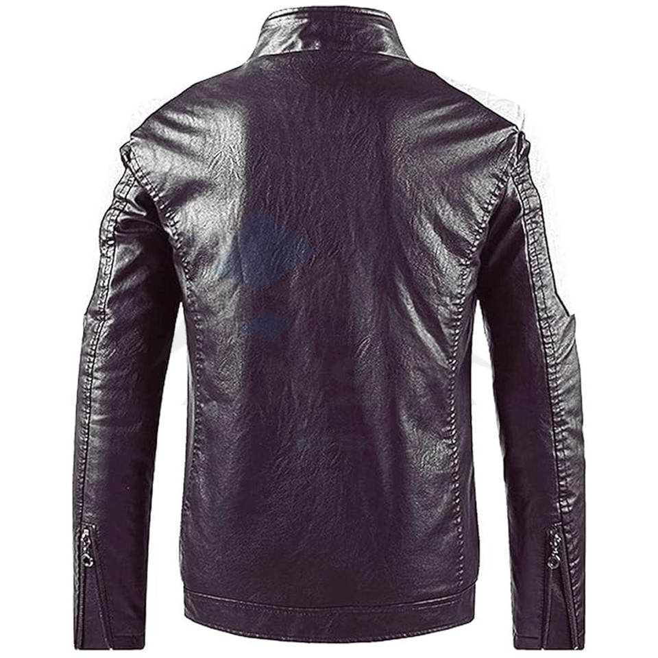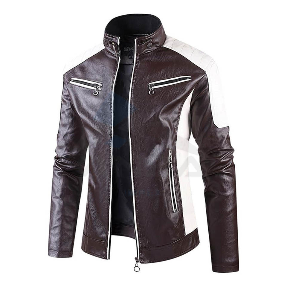 เสื้อแจ็คเก็ตหนังผู้ชายแบบซิปเต็มตัว คอตั้ง ดีไซน์บล็อกสี ทันสมัย เหมาะสำหรับฤดูใบไม้ร่วง สีน้ำตาลและสีขาว