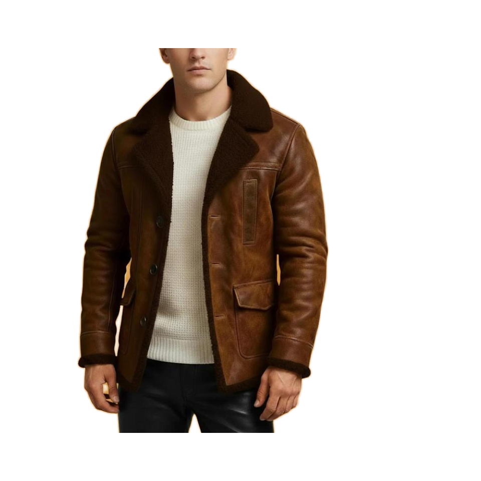เสื้อโค้ทหนังวัวแท้บุขนสีน้ำตาลสำหรับผู้ชาย ฤดูหนาว
